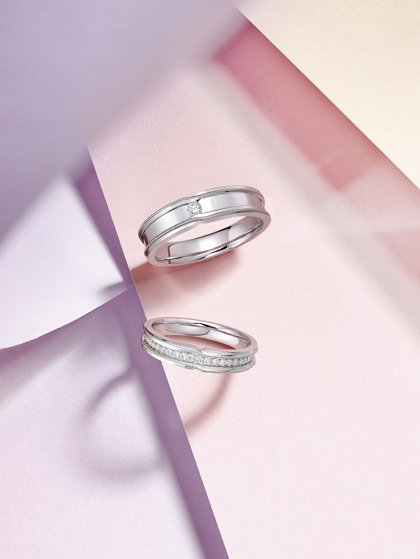 “为爱牵引”18K金钻石对戒,流畅的线条融入精致的珠边,颗颗闪钻犹如将浪漫的爱情故事串连成线,爱意从相遇的时刻无限蔓延。