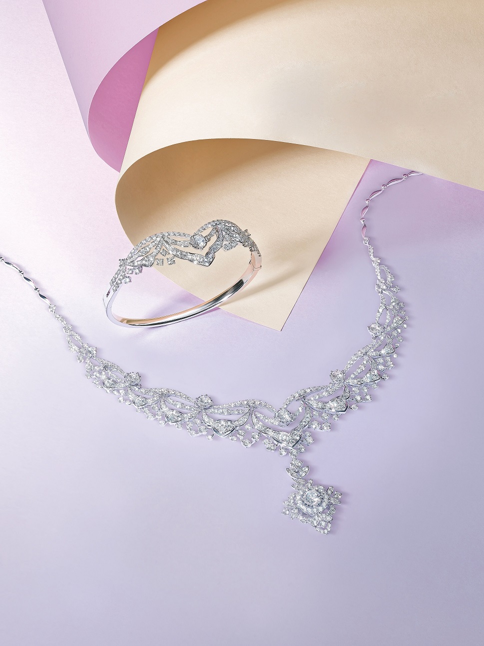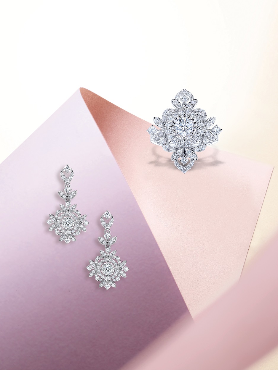张歆艺同款钻石套装来自六福珠宝婚嫁系列“幸福云彩”,将中式传统服饰的“云肩”融合耀眼闪钻,构筑爱情别样的浪漫。璀璨钻石坠衬于雅致线条上,层迭交织成一幅蕾丝云肩,华丽而绚烂,尽显东方美学。项链更可拆分成独立吊坠,灵活配适各种场合。