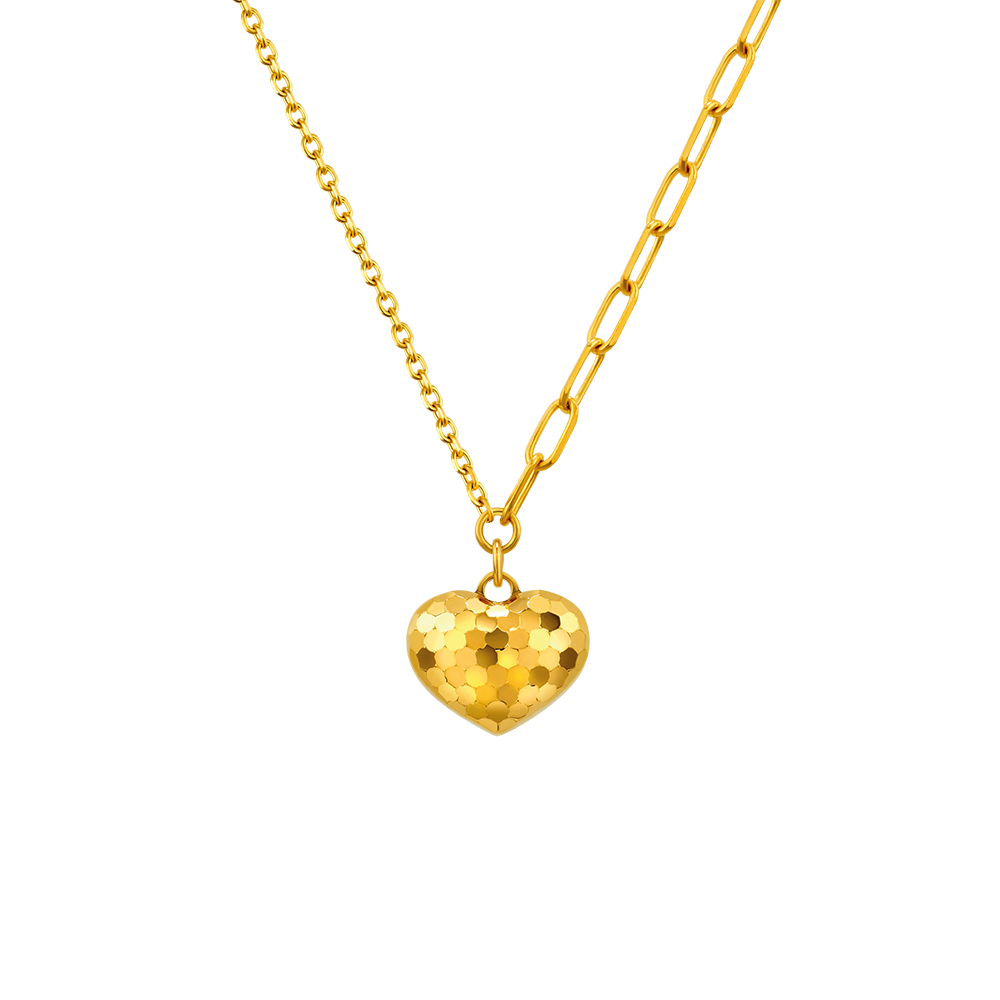 设计师采用独特的3D钻石切割工艺,经镭射无焊料焊接后造成的蜂巢图案,犹如闪耀派对上的镜球,闪闪发亮,崭新的工艺令Goldstyle首饰多维度呈现出微鼓的效果,立体度更强。爱心链坠在多角度的光影折射间绽放夺目光芒,倍添闪烁效果,设计简约,气质百搭。项链还有Goldstyle·X镶钻款以迎合不同风格的需求,展现出足金的华丽和钻石的璀璨融合。