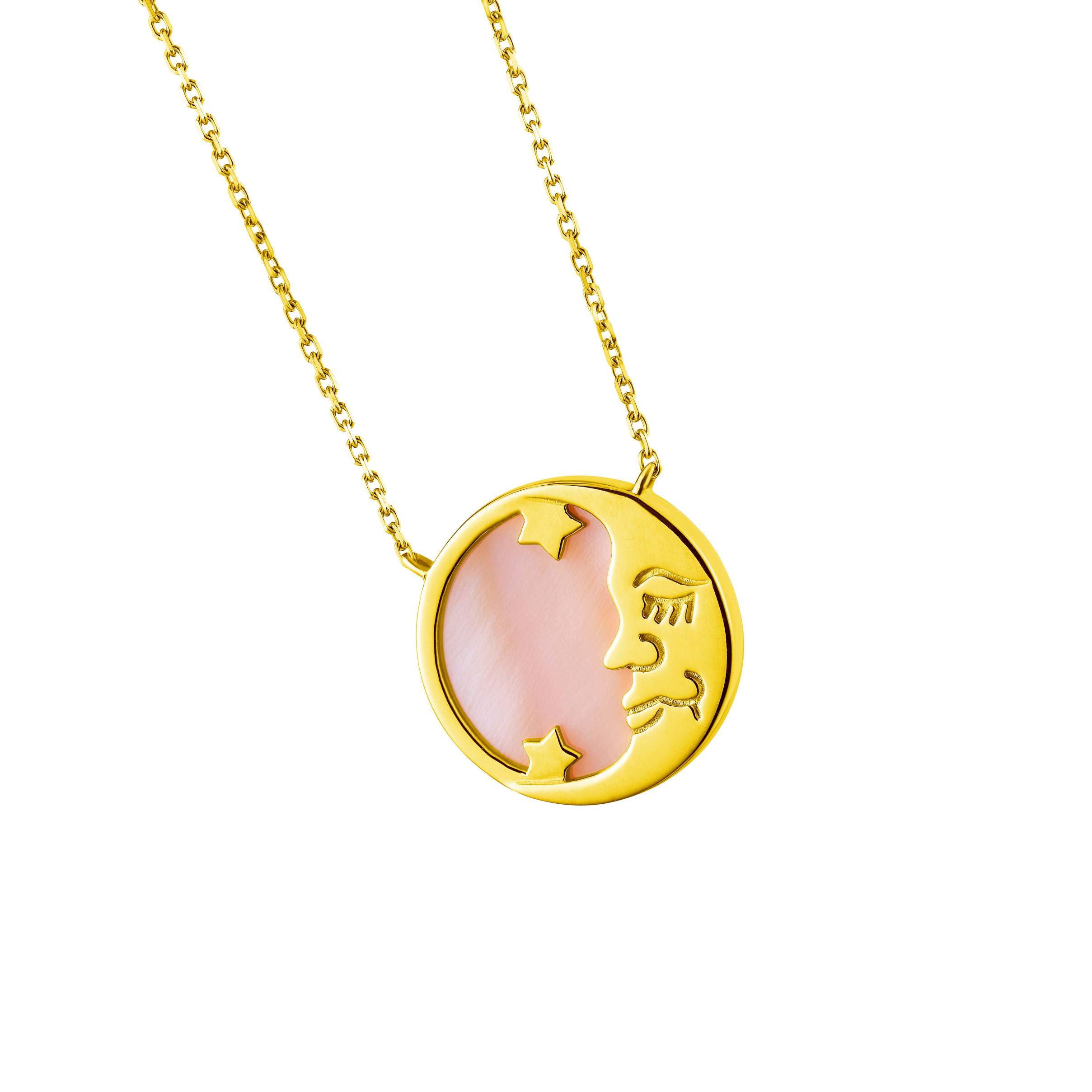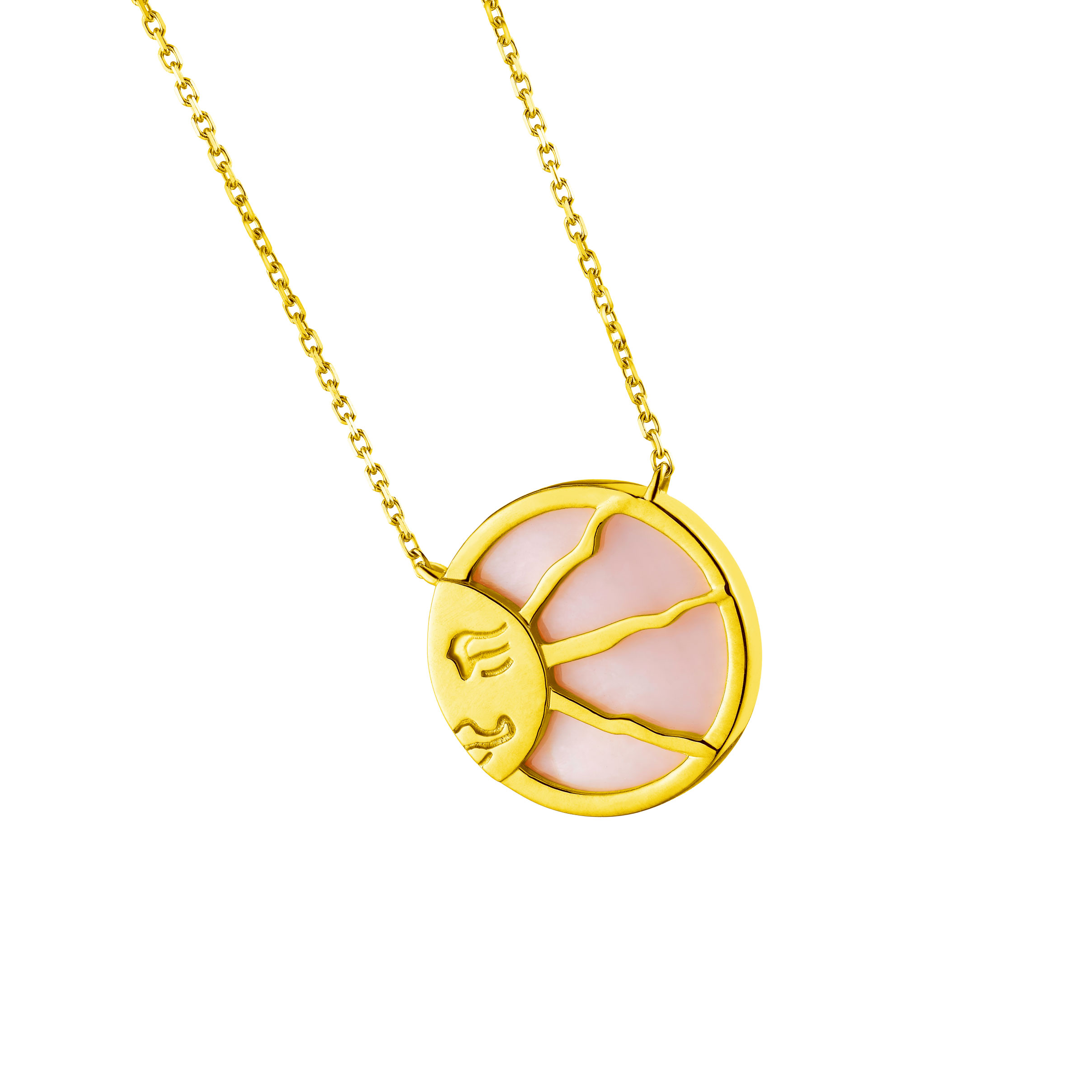 浩瀚宇宙里,太阳及月亮为世间带来光明与希翼。设计师以足金线条勾勒阳光漫射的璀璨图案,与充满新鲜活力的粉红色贝壳互相映衬,愿为世间情侣送上温暖祝福,出席特别场合或日常佩戴更显标致出众。
