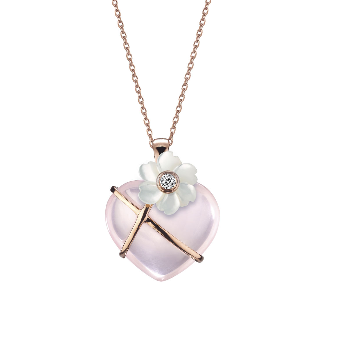 母亲是每个人心灵深处温暖的一道阳光!每一次全家团聚,她总会为我们张罗一顿丰富的美食。在这个满载祝福的母亲节,为她送上一件精美首饰,感恩这些年来无微不至的照顾!晶莹剔透的粉晶塑造出满载深厚情意的心形,搭配贝壳材质的花朵造型并以璀璨美钻点缀花芯,让我们挚爱的妈妈心花怒放,尽展娴熟大方之美。