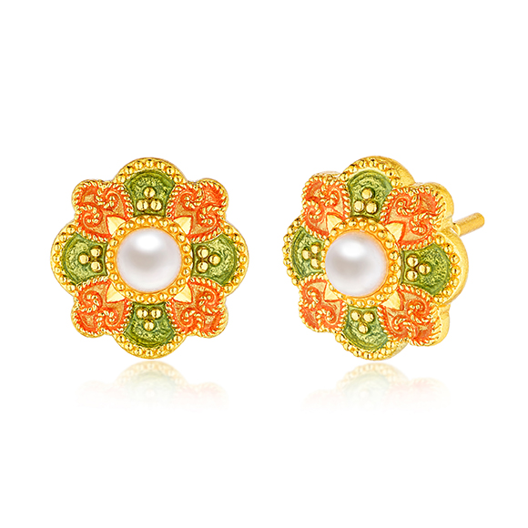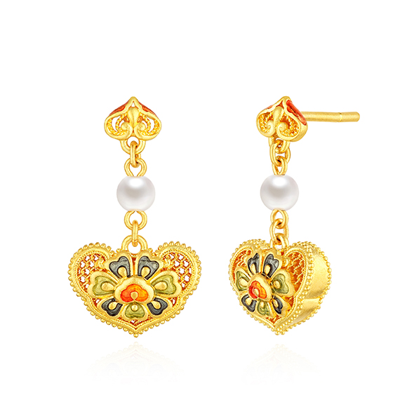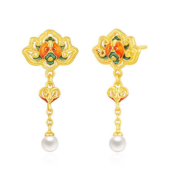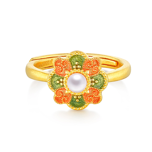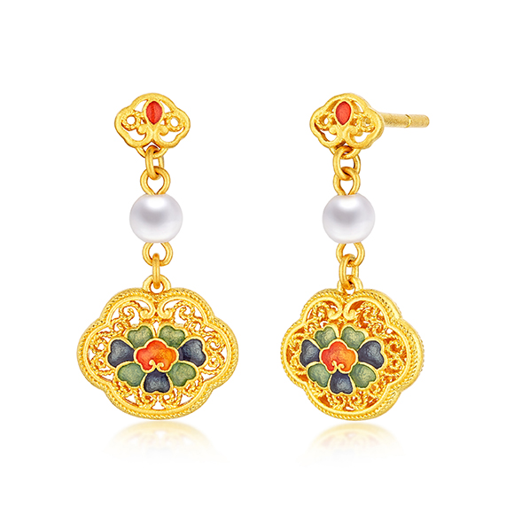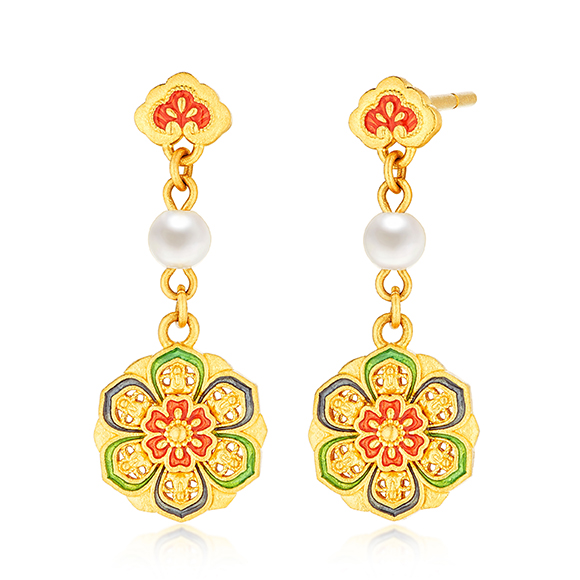 祥纹宝花,韵彩国色,是集百花于一身的理想之花。花瓣层叠尽显富丽华美,花型对称寓意和谐圆满,搭配珐琅、珍珠作点缀,与黄金相互映衬闪耀夺目,祈愿美好常伴左右。 |