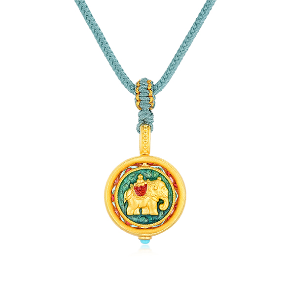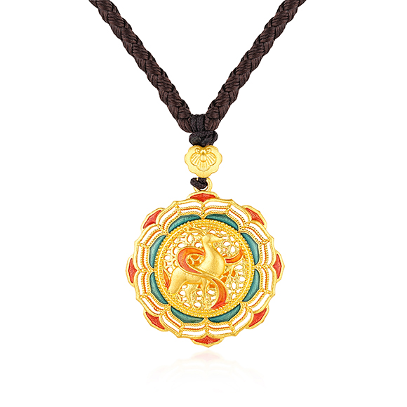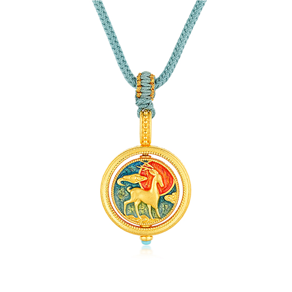 九色灵鹿 红日升起,祥云环绕,以足金錾刻立体灵动的九色鹿造型,结合可转动内芯设计,呈祥献瑞,承载福来运转之美好祝愿。 |