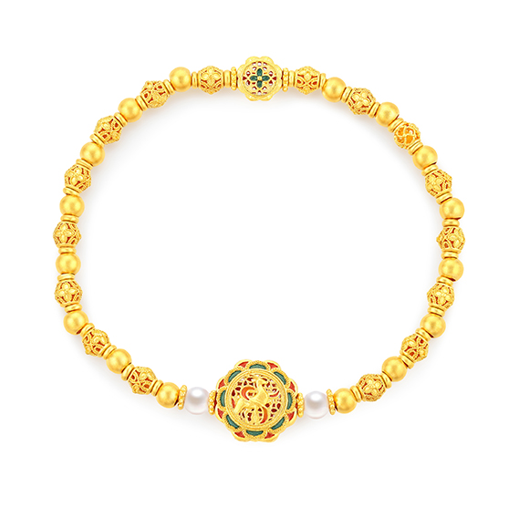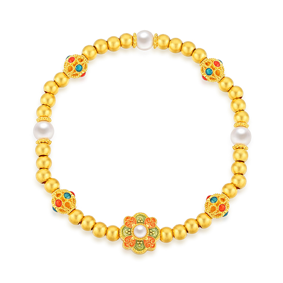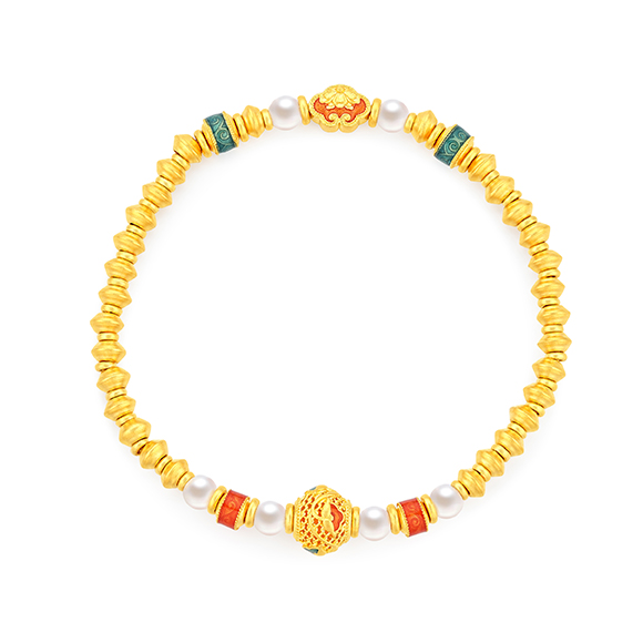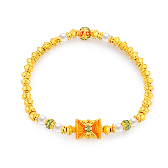 宝相彩霞 祥纹宝花,金绽韵彩!将敦煌壁画的浓墨重彩凝于宝相花间,绽放绚烂之姿。莹润珍珠与黄金相互映衬,五彩斑斓,诗意翩跹。花纹结构多采用“中心对称式”设计,多圈款手链还可作项链一款多戴,百变随心彰显个性。祝愿佩戴者吉祥富贵,幸福美满。 |
