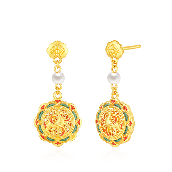 金狮献瑞,如意吉“象”!鹿守太平,福满人间。狮子代表着祥瑞之兆,象征好运和幸福。瑞象来仪,国泰民安,大象代表吉祥和富贵。鹿与“禄”同音,寓意着健康长寿、福禄安宁。将敦煌文化中的灵兽图腾,于金饰上展露灵动妙趣,传递守护四方平安的美好祝愿。极具质感的黄金,融合古法花丝工艺与绚丽珐琅,玲珑剔透,佩戴于身凝万千华彩又夺目众人,是寓意吉祥与美学魅力兼具的艺术精品。