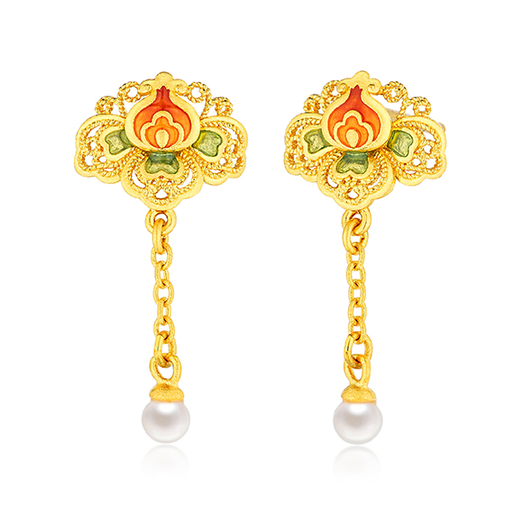 榴韵繁花 繁花入饰,锦绣敦煌。以极具西域风情的榴花为设计元素,加以珍珠点缀,融合珐琅工艺, 金韵天成,“榴”光溢彩!象征繁荣富贵,多子多福。 |