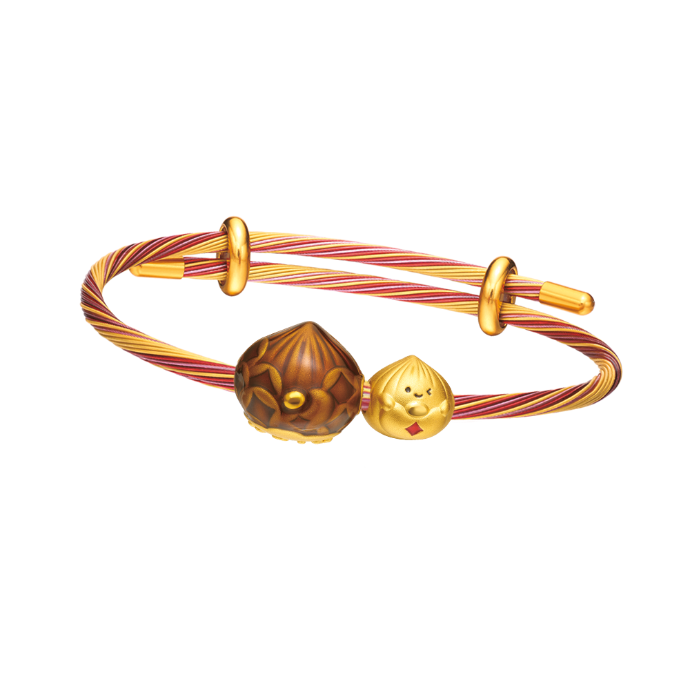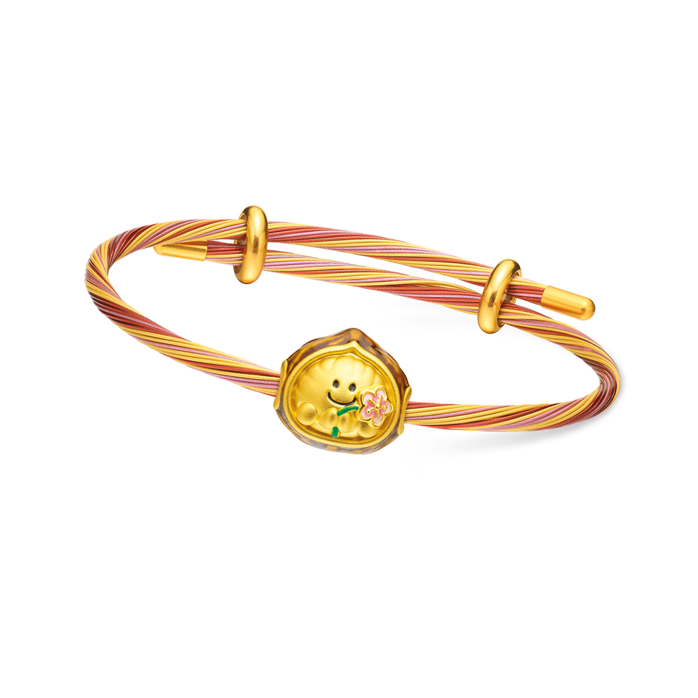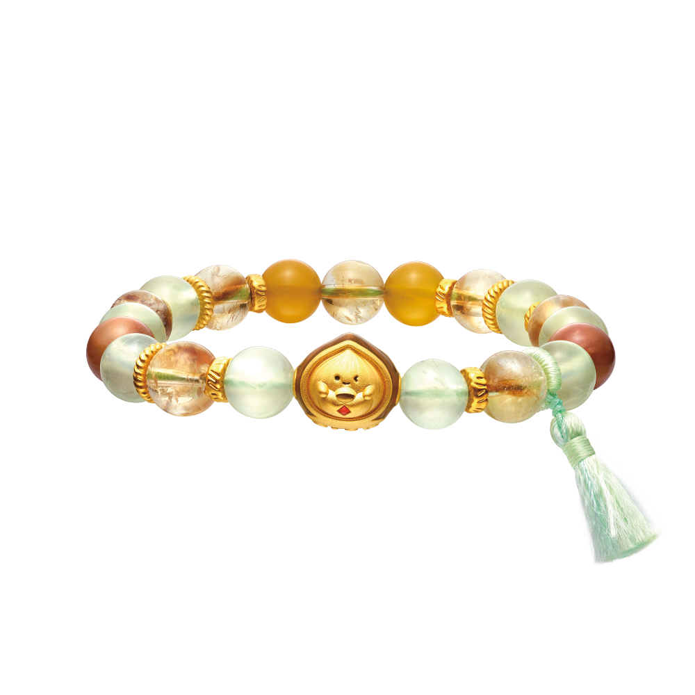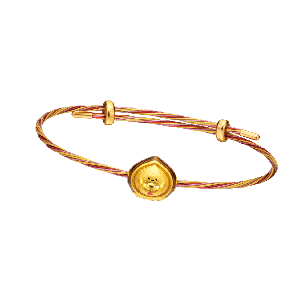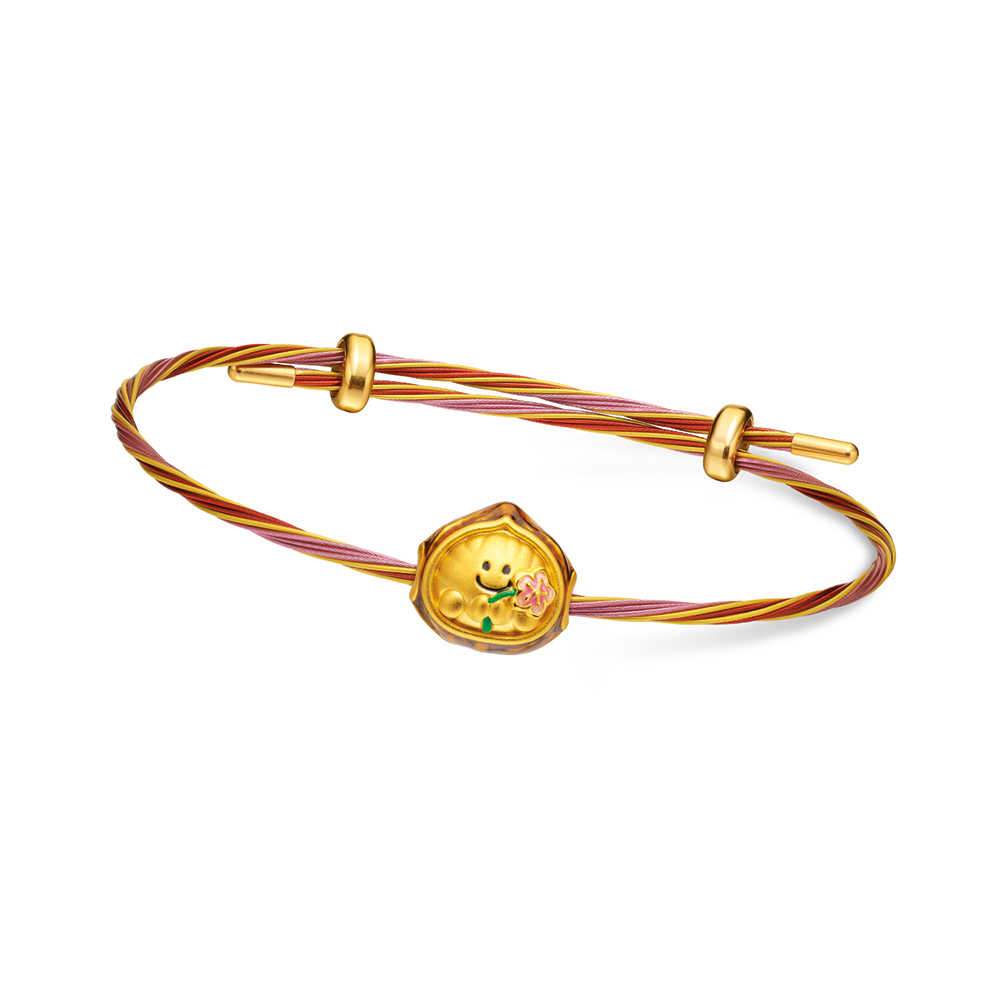 笑意甜甜的核桃宝宝手握粉嫩桃花萌力登场,陪你踏上和美与幸福的甜蜜之旅。粉晶也被称为“爱情之石”,浪漫柔美的淡粉色,寓意招桃花、促甜蜜、增人缘;明亮耀眼的黄塔晶元气满满,赋予阳光般开朗的自信与活力;结合象征智慧的核桃宝宝萌趣点睛,以一抹俏皮的金与活泼的跳跃色彩,瞬间融化少女心,提升温柔的魅力。生机盎然的桃运鎏光在腕间闪烁,愿这条可爱与正能量并存的手链,能让你将美满与好运牢牢“串”在手心。足金串饰另有手绳款,也可配链作项链佩戴,搭配顺从心意,让爱自然流转。愿爱逢其时,和乐美满。