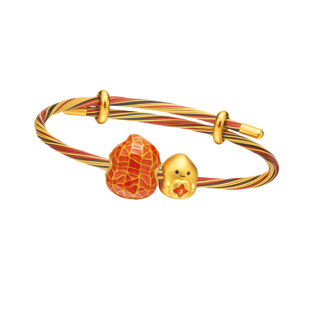 圆滚滚、金灿灿的花生萌宝,双手紧抱寓意吉祥的小柿子,期待好事发生。朱红鎏彩点染外壳的天然纹路与柿蒂轮廓,生动细腻,萌化人心,瞬间点亮腕间元气。像阳光一样温暖明亮的黄塔晶被誉为“财富之石“,传递招财纳福、吸引好运的美好祝福;拥有独特金色猫眼效应的金虎晶灵动闪耀,象征勇气与魄力。当活泼可爱的吉祥物花生萌宝足金串饰,遇上寓意招财小太阳黄塔晶和气场小老虎金虎晶,便是集结萌趣、祝福及能量的王炸组合,犹如将“可爱”、“勇气”、“财运”戴上身,不仅是日常穿搭的可爱担当,并时刻提醒:生活甜蜜,好事正在“花生”。串饰另有独特制作的彩色软钢丝手绳可供选择,满足不同搭配需求;趣味Max版足金串饰更有可拆分的趣味设计,果仁与花生壳可分开搭配,果仁轻旋背面浮现“好”字,与花生一起静候好事佳音;赤色外壳坚实如鞘,犹如心灵的守护与能量源泉。配送两条手绳,亦可作情侣款佩戴,祝愿共享满满的财运与福气。将可爱花生随身相携,愿好运常相伴!