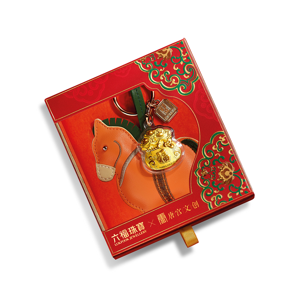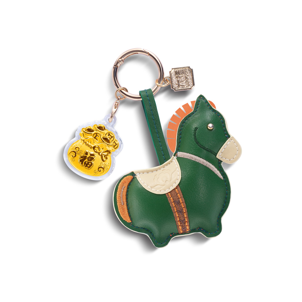 | 古今结合、萌趣十足的墩墩小马背着装满财宝的足金福袋,象征财富与福气代代相传、绵延不绝的祝福。国风拼色皮革小马挂件,镌刻上雅致的花纹图样,柑橘橙与苍翠绿的配搭既彰显盛唐的华美亦充满时代感,饰上六福珠宝x唐宫文创的标志吊牌,令挂饰更添价值与意义。将祝福随身携带,祈愿好运随行。