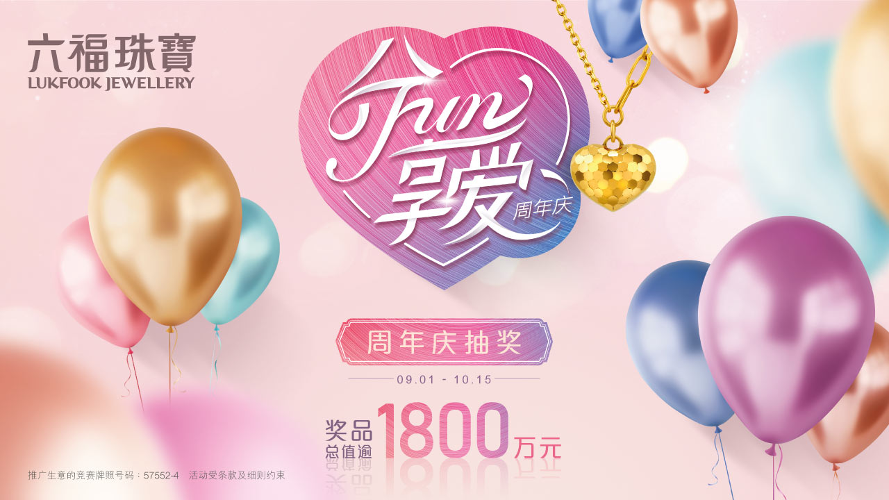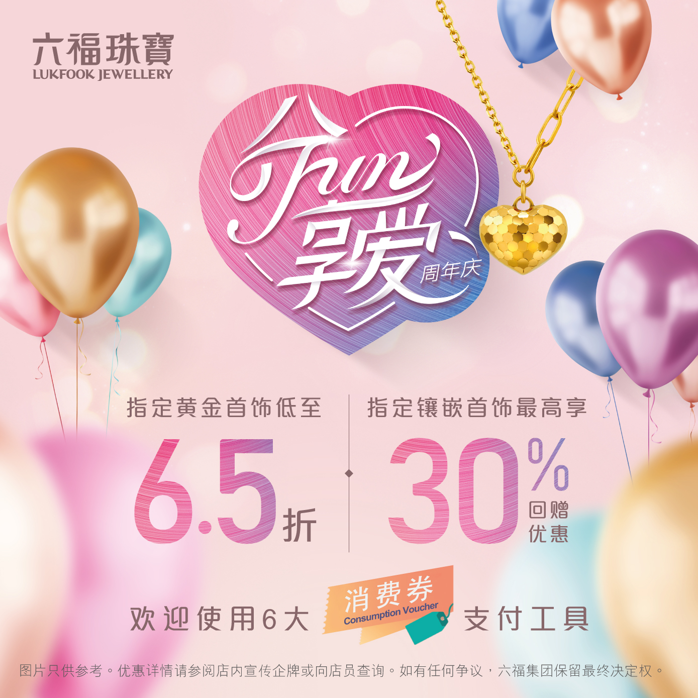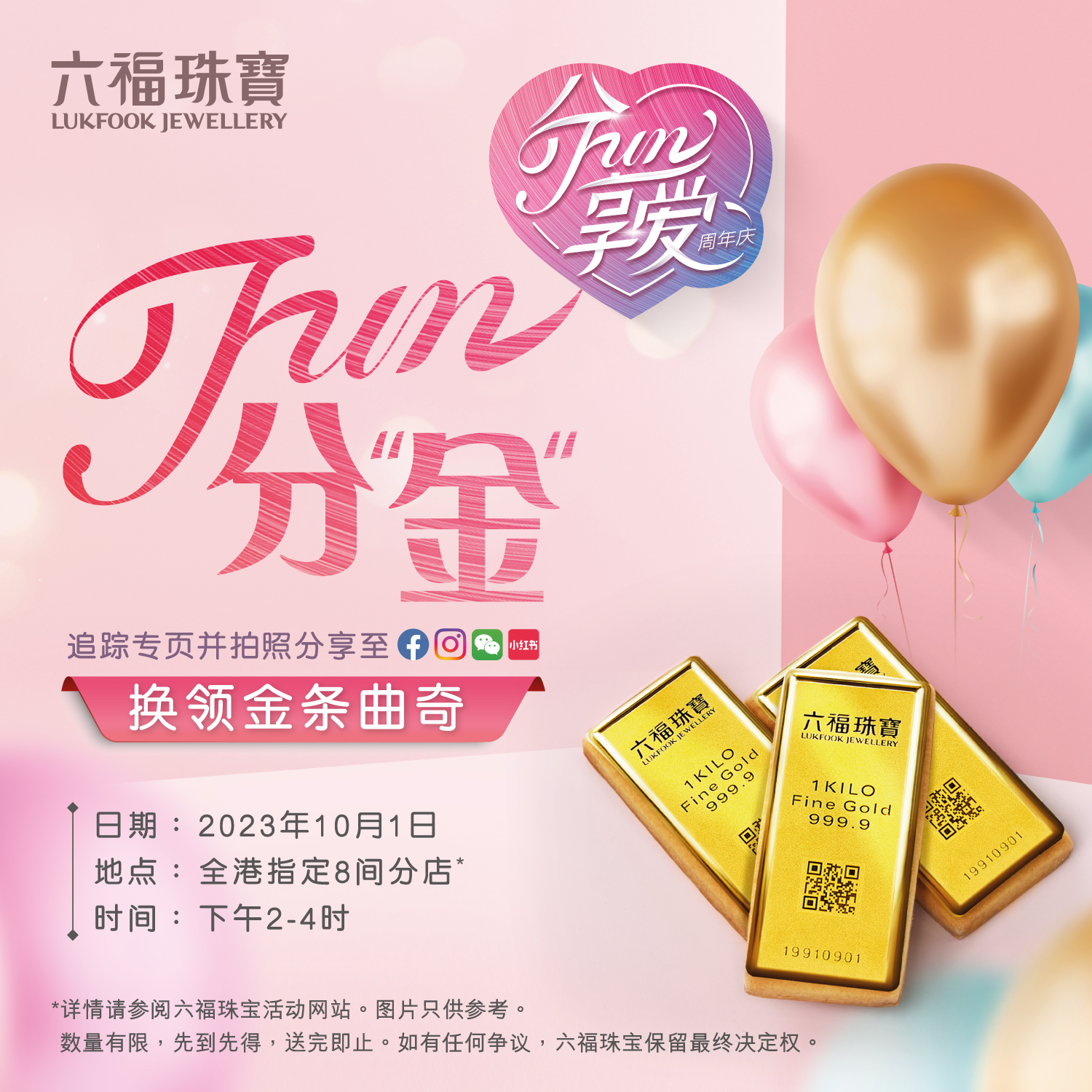 六福珠宝为庆祝周年庆,推出大抽奖及一系列店铺活动与大家“FUN”享爱。奖品总值超过1,800万元,大奖更可获高达1万元购物扣减优惠!为喜悦加码,于10月1日于指定实体店更推出“FUN”分「金」曲奇换领活动,以精致又充满创意的金条造型曲奇,和大家“FUN”「金」同味,分享更多喜悦。