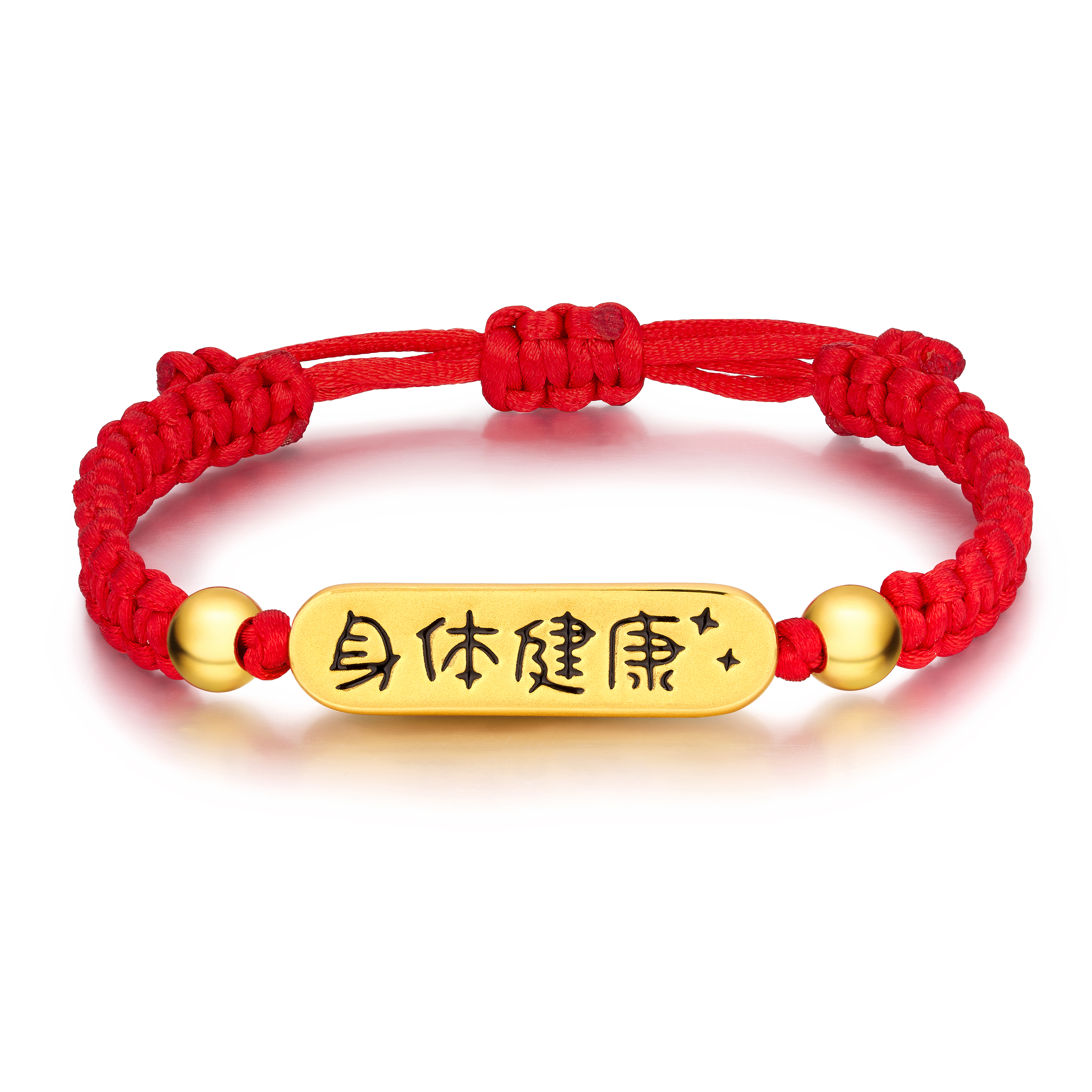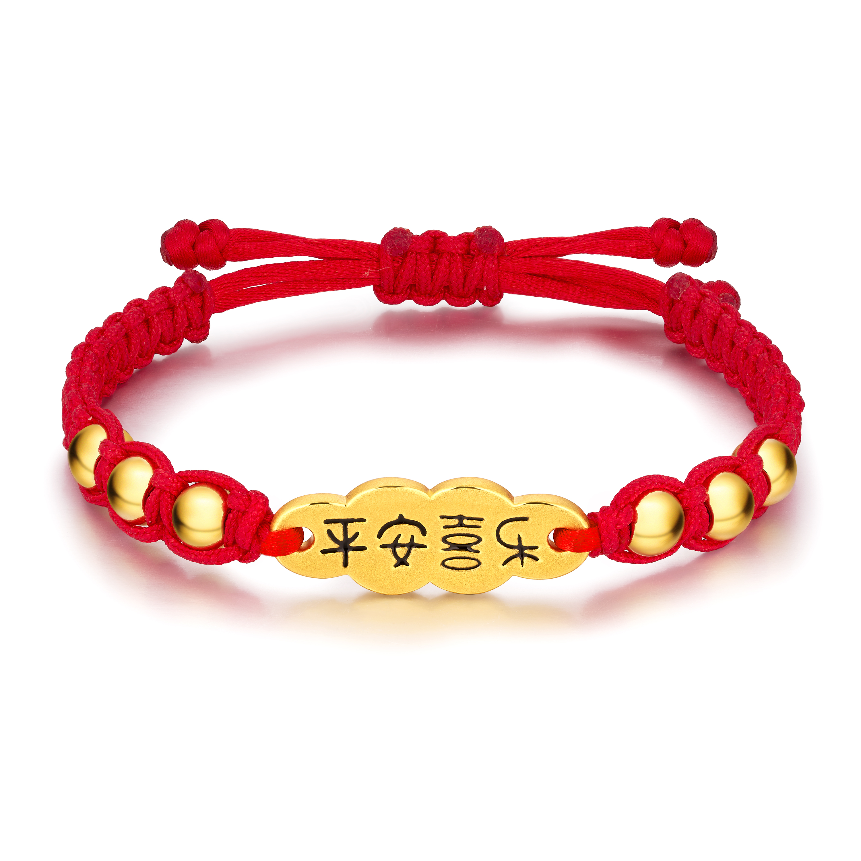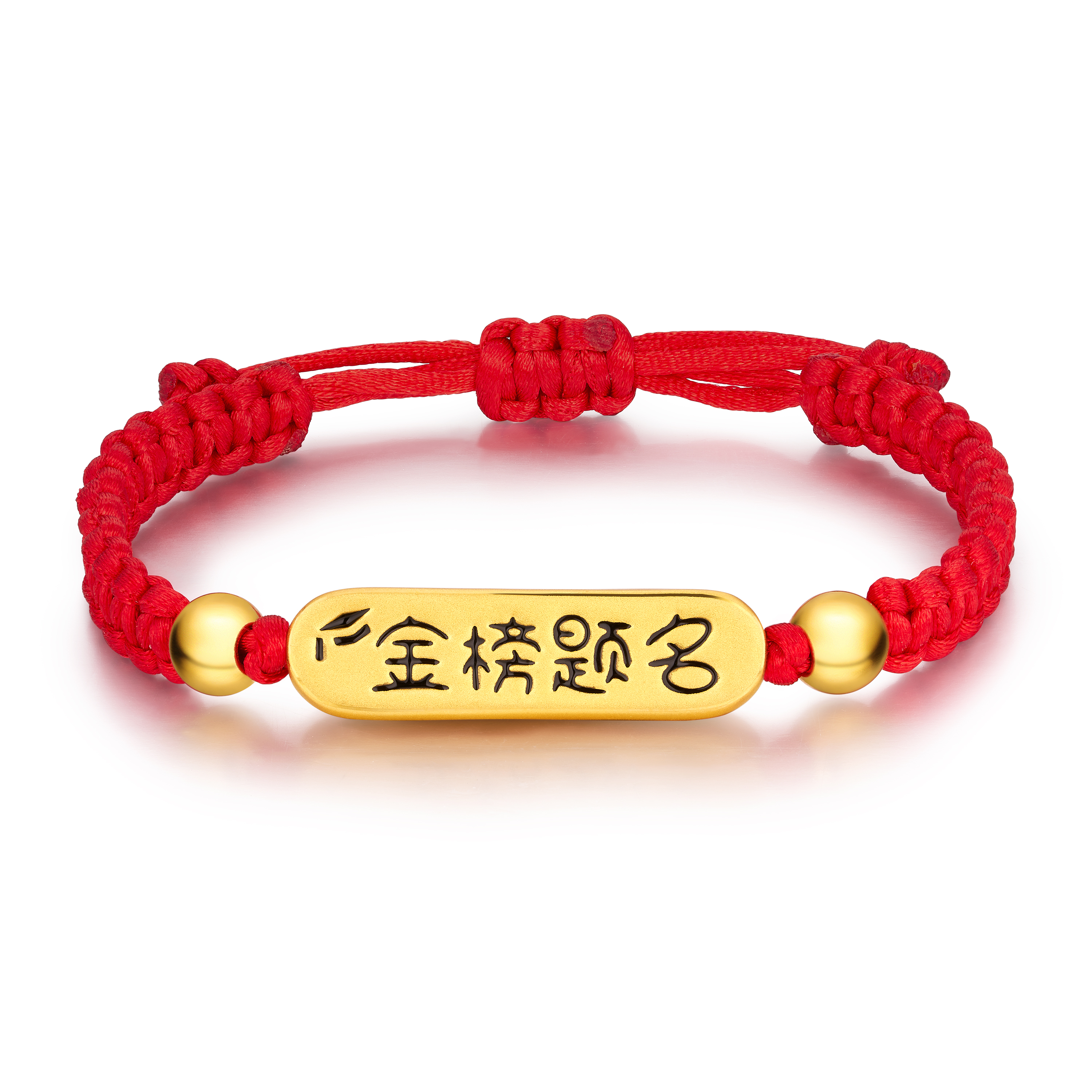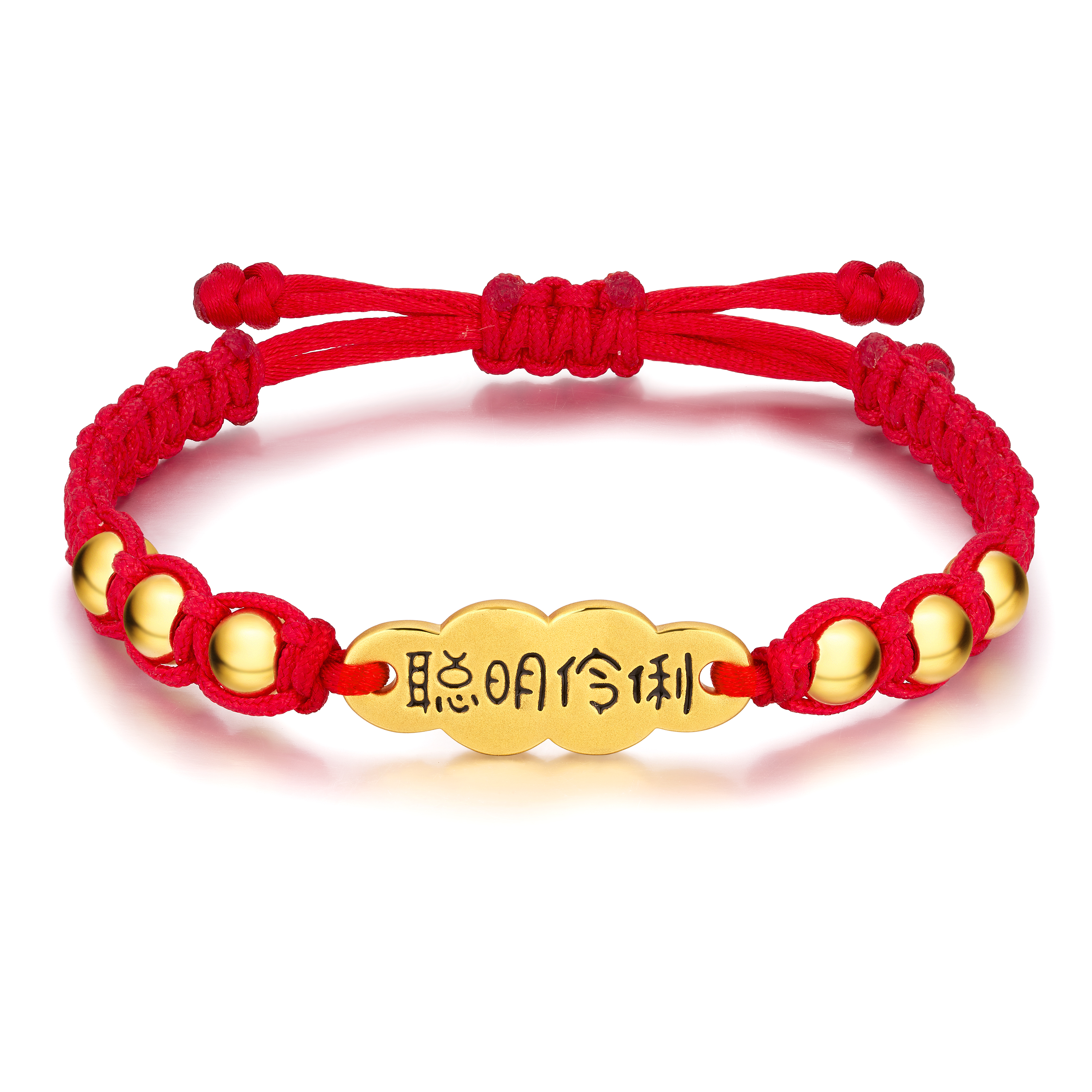 云朵造型设计的足金金牌,简约别致,字牌双面分别印制 “聪明伶俐”与“平安喜乐”字样,祝愿学子们幸福聪慧、 茁壮成长,手链左右还设计了三颗金珠,既有连中三元美好祝愿,又有六六大顺的吉祥寓意,是对莘莘学子未来与成长的美好期盼与祝福。