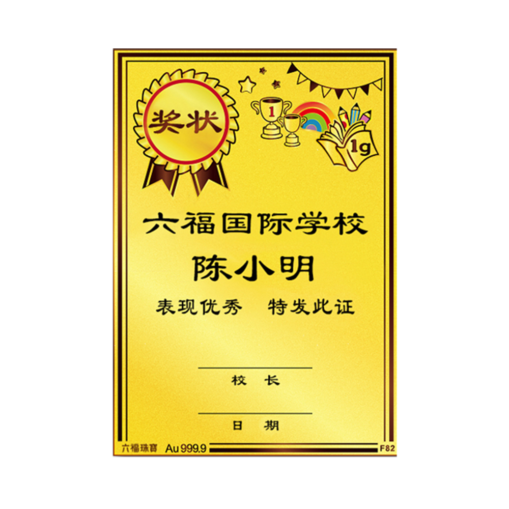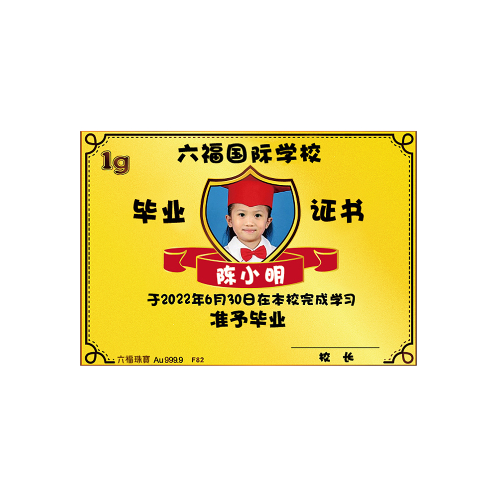 闪耀的足金证书,是对过往学习和人生重要阶段的一份见证,且具有收藏价值。足金证书有证书和奖状两个样式可以选择,可以自由定制姓名和学校名称的组合;还能印制彩色学生照以及学校校徽,还有配套精美外框可自由选择悬挂和摆放,寄予毕业生美好的期望和祝福。