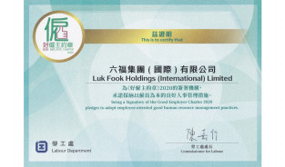 (2020年10月22日) ── 六福集团(国际)有限公司(「六福」/「集团」)(股份代号:00590)欣然宣布集团成为《好雇主约章》的签署机构,并获颁发参与《好雇主约章》证书,以嘉许集团秉承以雇员为...
