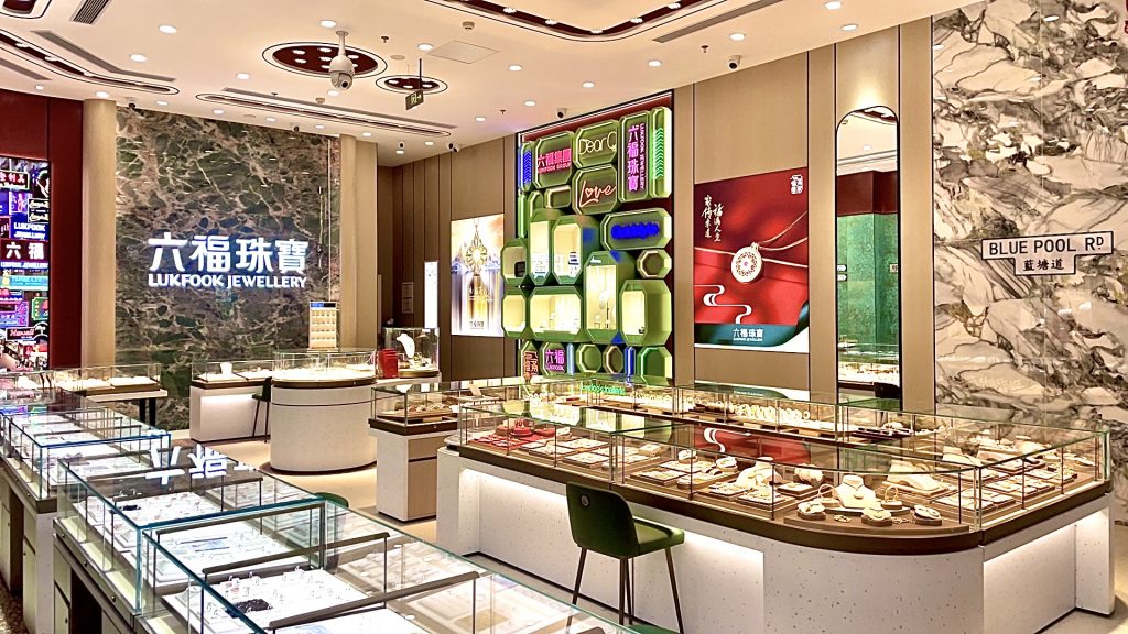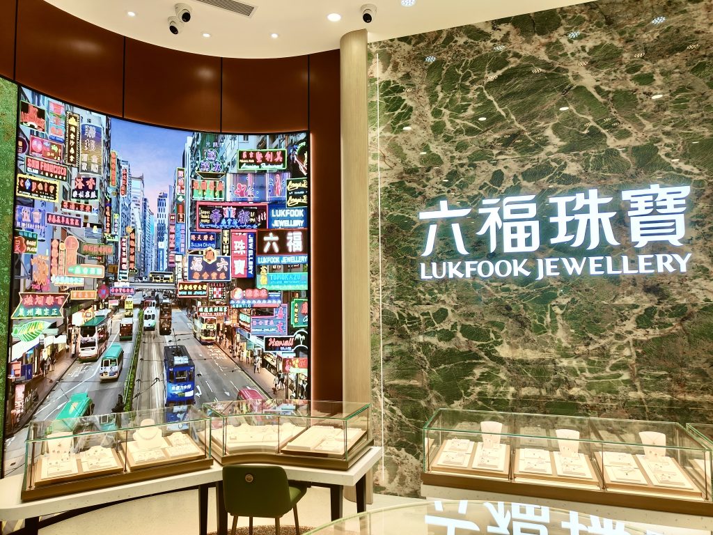 六福珠宝香港情怀主题概念店,以复古港风为设计风格,融合品牌底蕴与香港地域 文化。店铺运用香港怀旧特色的霓虹灯照片、灯牌,展现车水马龙旧街景的墙面装饰,营造浓郁复古港风氛围,打造富有文化内涵与独特体验的购物空间。