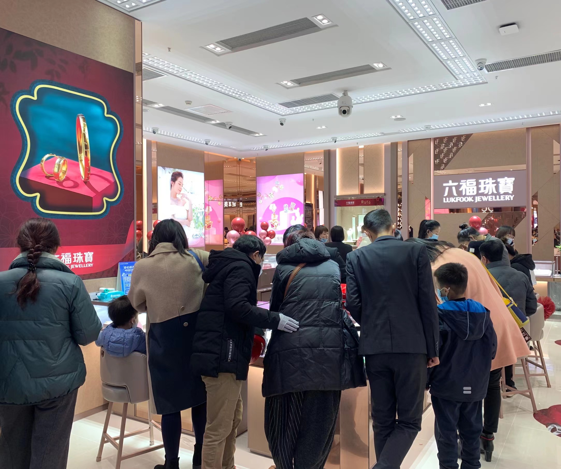 开业当日,锣鼓喧天,喜庆热闹,当地居民纷纷慕名而至,人潮涌动,气氛十分热烈。「六福专柜」高档雅致的装潢风格、精心布置的陈列展示以及款式新颖的珠宝首饰,无不从点滴之处彰显品牌的高贵、独特,吸引了众多顾客驻足挑选。销售人员为每一位前来选购的顾客提供专业、挚诚的导购服务,或细心推荐饰品,或贴心提供试戴服务,令顾客从进店至离开,每分每秒都能享受到宾至如归的服务。