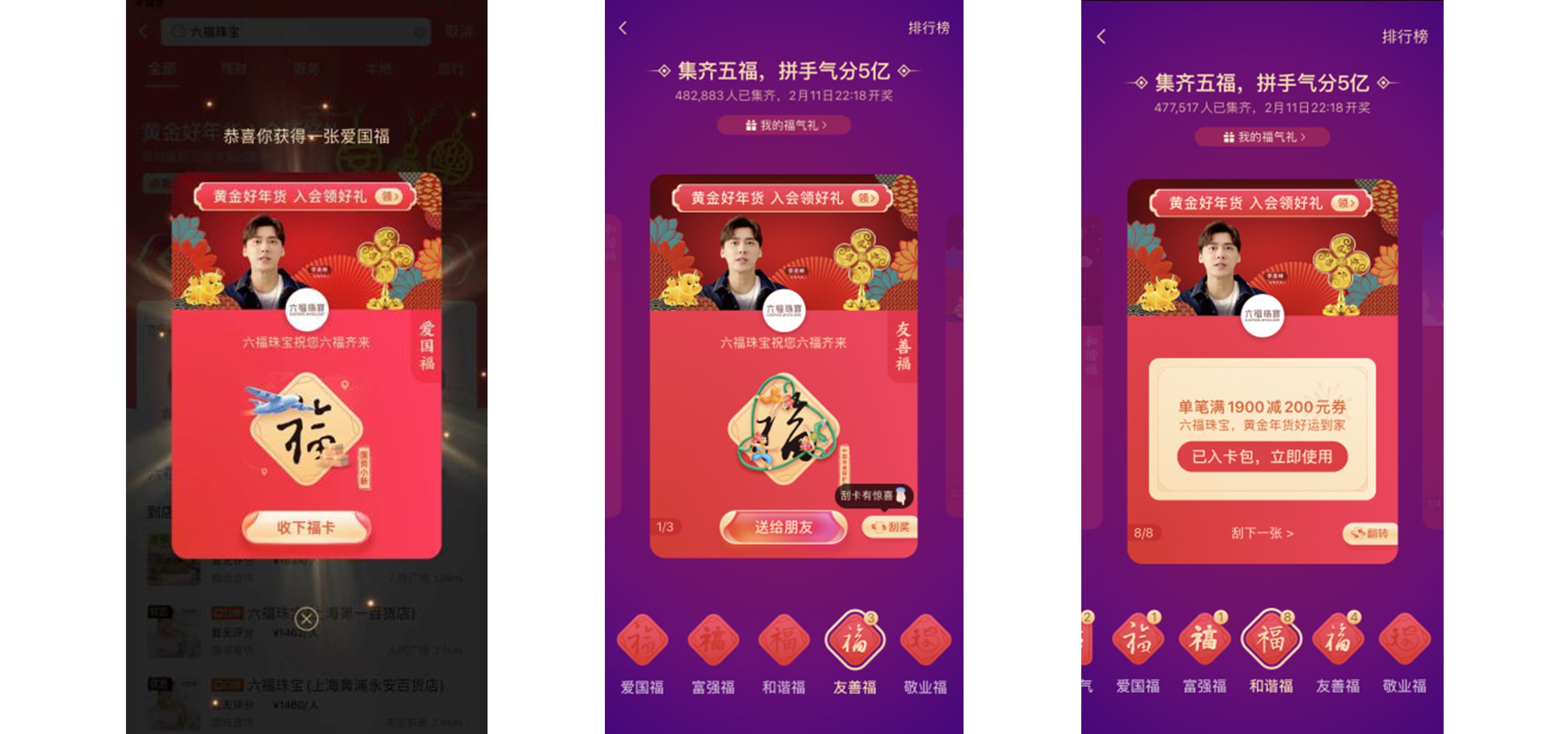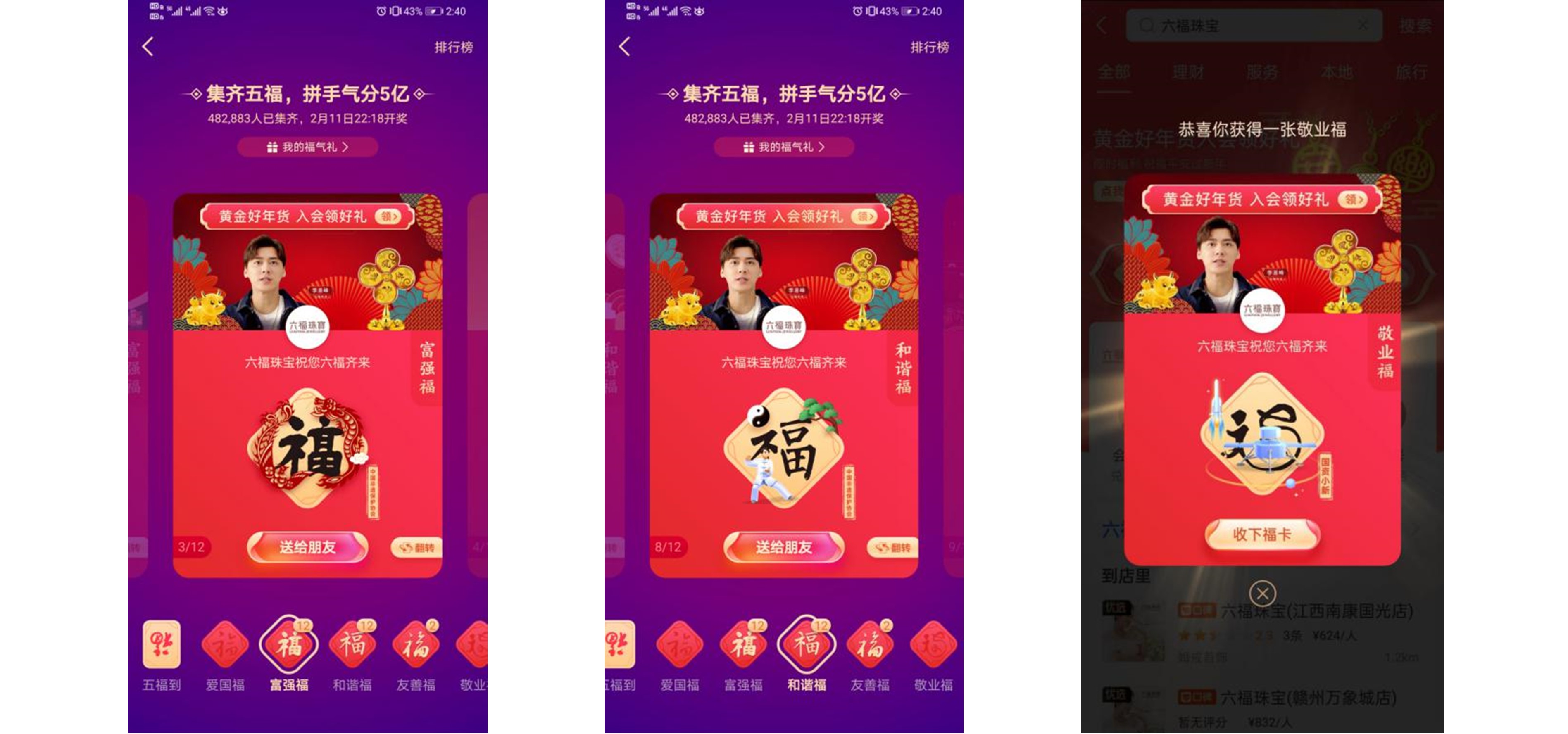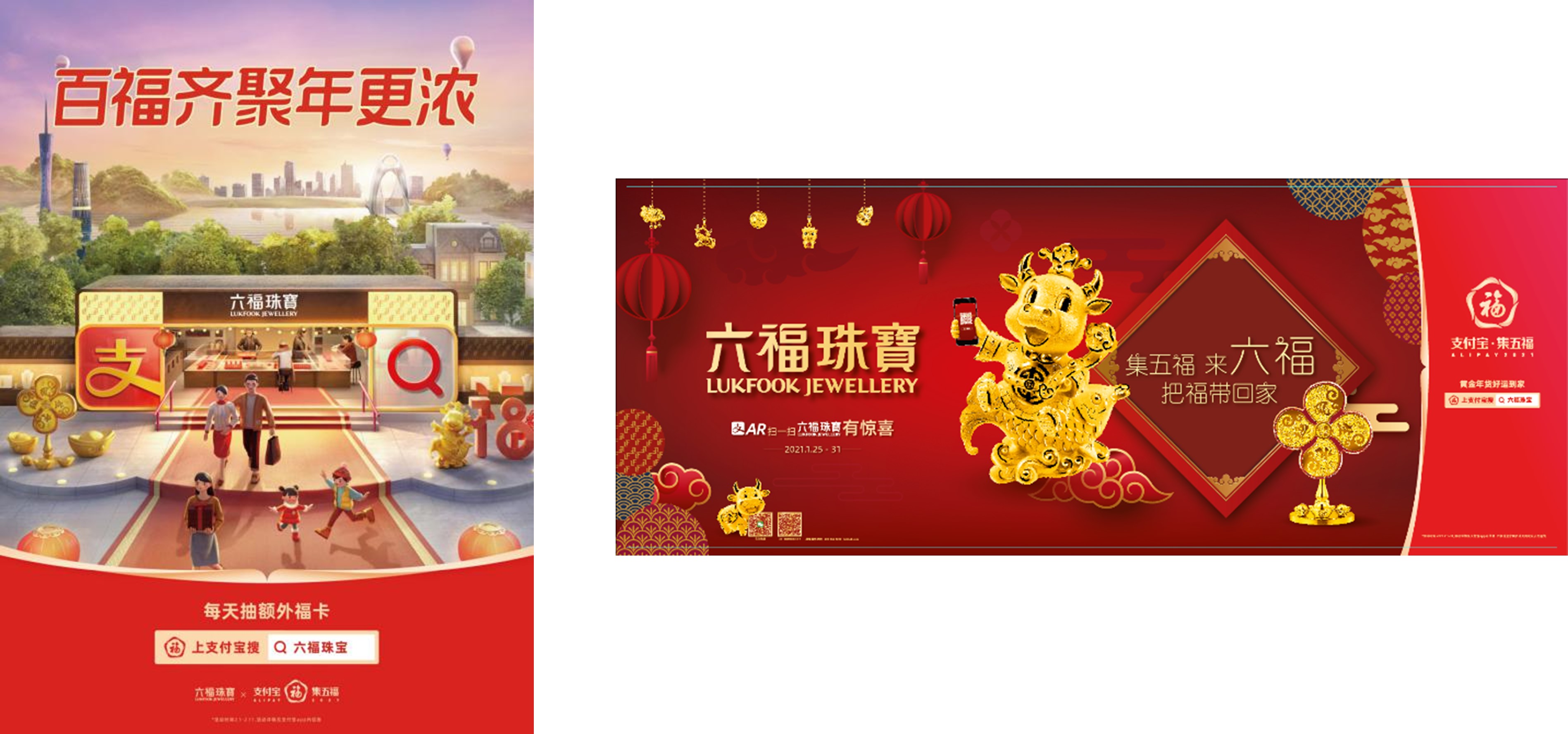 (2021年2月1日) ── 六福珠宝再次与支付宝携手合作,与一汽大众、招商银行、蒙牛、顺丰、学而思教育等知名品牌一起参与「2021年全民新年集五福」活动。