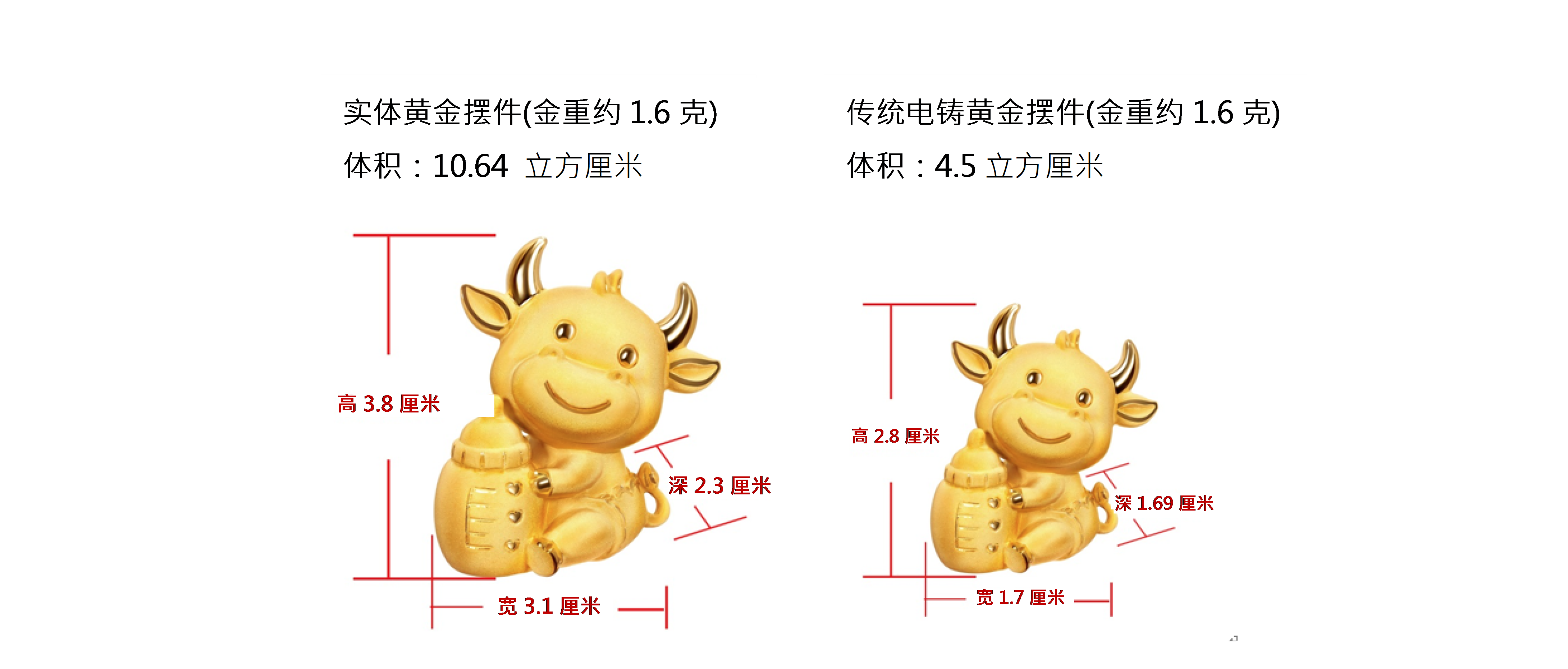 「实体黄金摆件及其电铸方法」工艺独特,揉合市面上不同黄金摆件之优点于一身,质感亦可媲美厚重的实心黄金摆件,美观和具有立体感,大大提升了造型上的可塑性。传统电铸黄金摆件只限于观赏性质的摆设,而「实体黄金摆件」突破传统电铸黄金摆件质地软和易变形的限制,其良好的抗变形能力让顾客可以置于掌中欣赏。相较传统电铸黄金摆件,两者在相同黄金重量下,「实体黄金摆件」的体积更比传统电铸黄金大约一倍,性价比高。