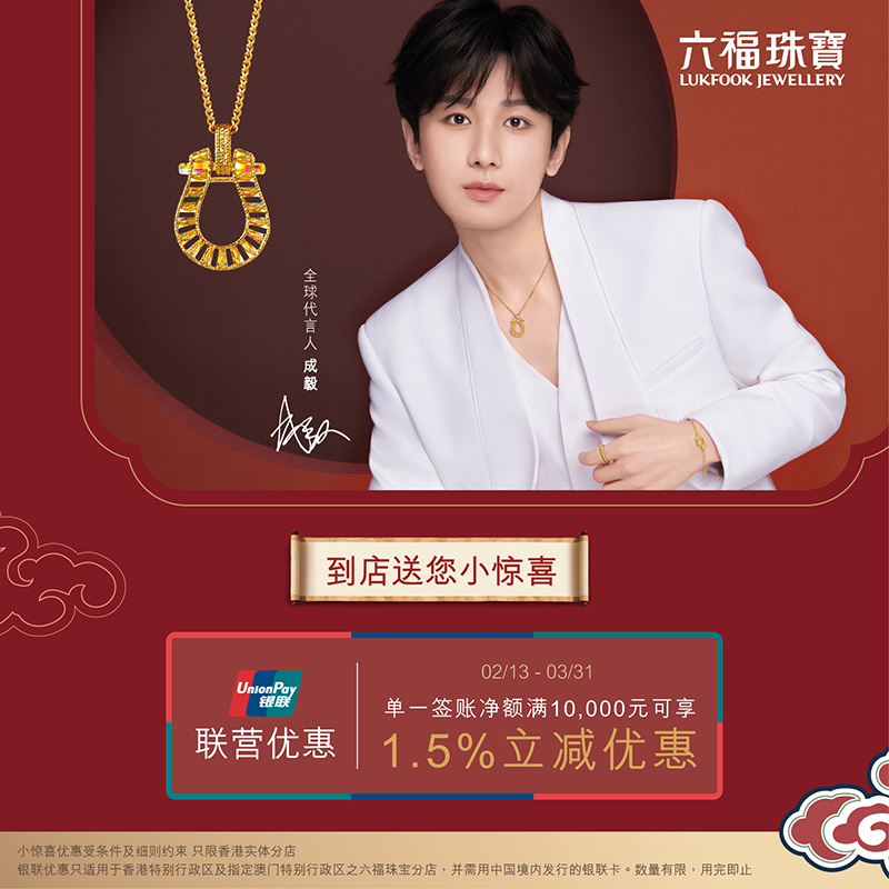由2026年2月13日至3月31日,于全线香港及澳门之六福珠宝分行(启德双子汇分行除外),使用中国境内发行的银联卡、银联手机闪付或银联二维码,即可享以下2个优惠: