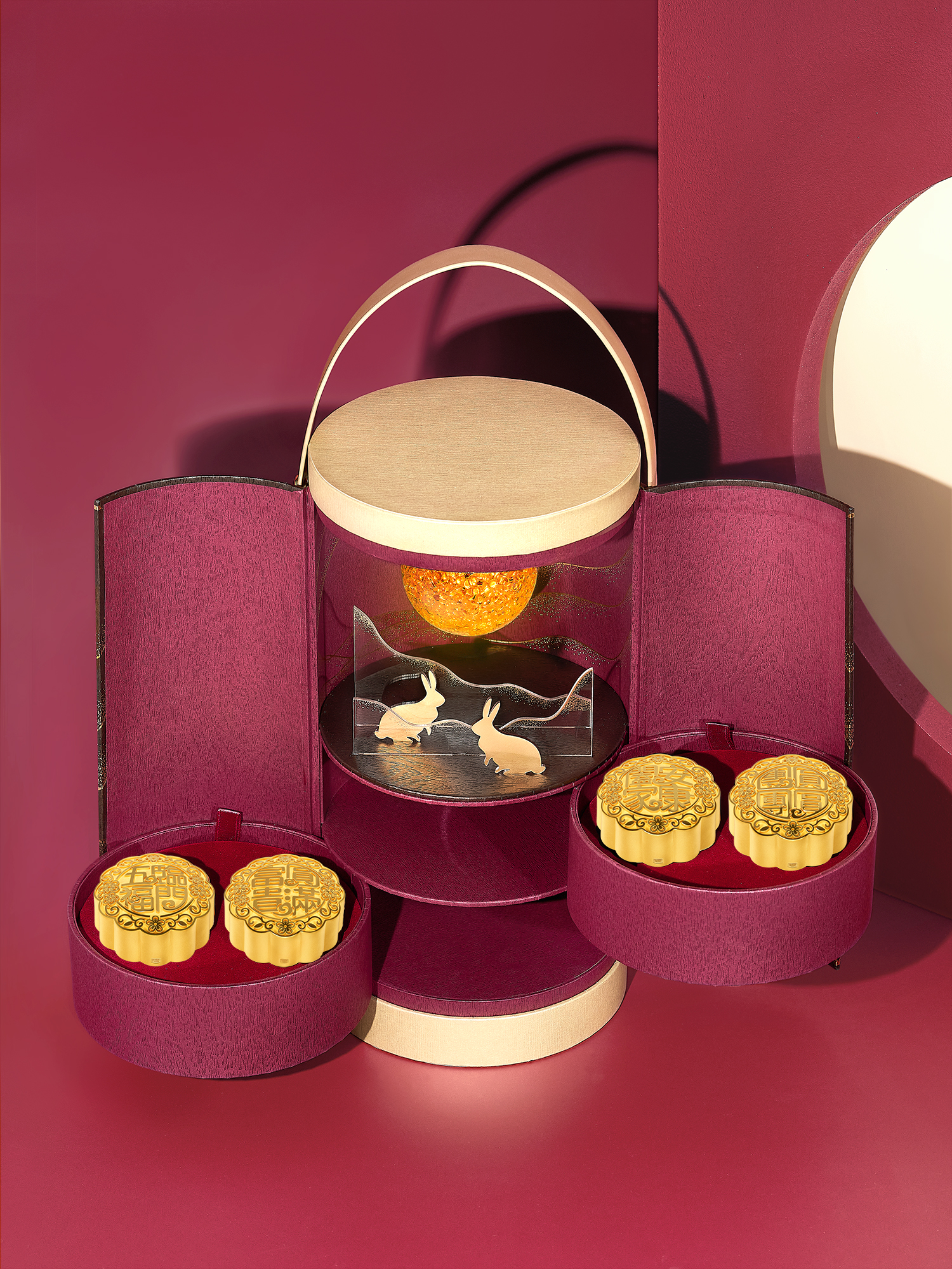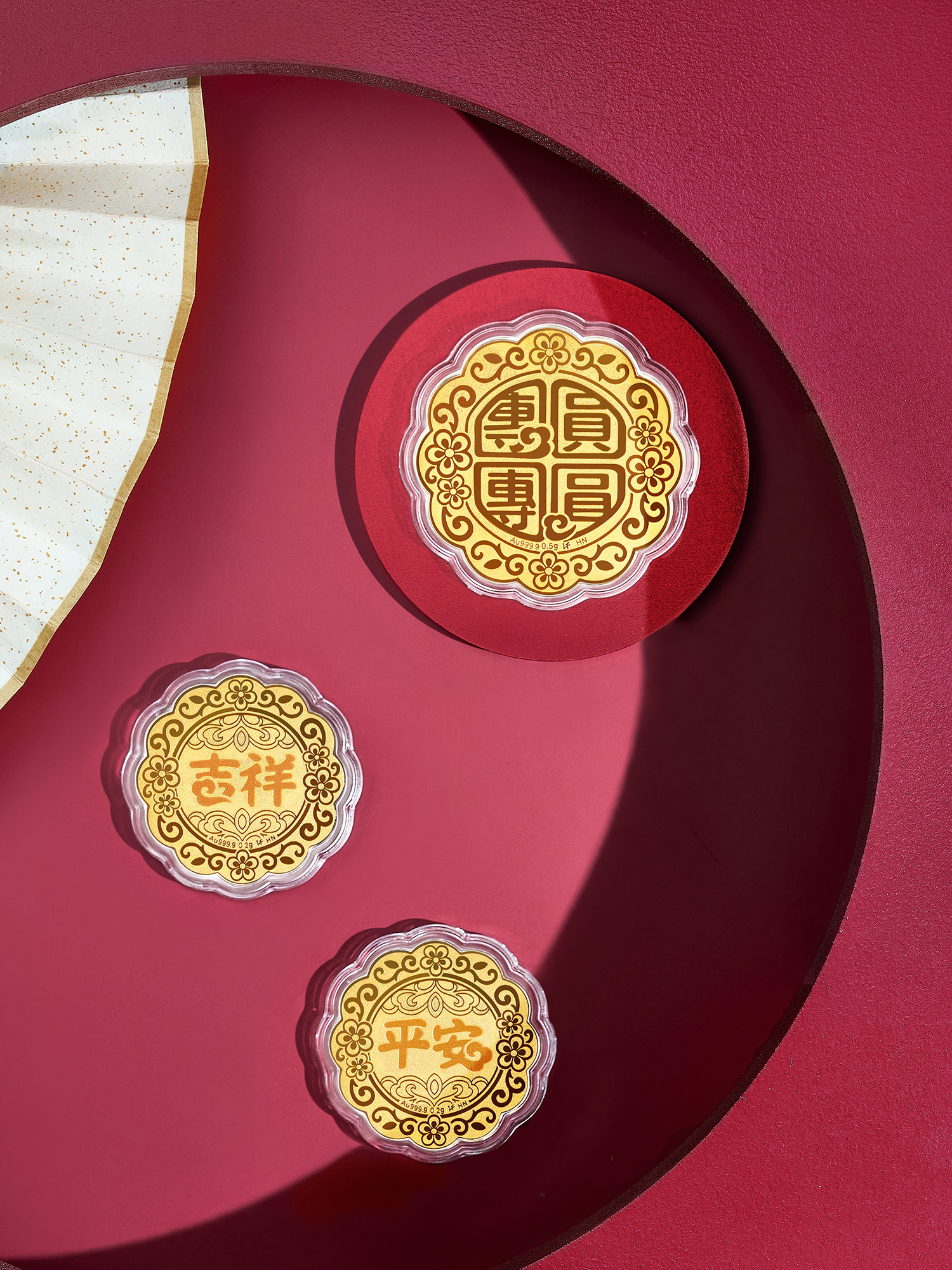 足金月饼工艺品备有0.5克及0.2克款式,每件均配上精美礼盒包装。现凡购买足金月饼摆件四件套装或七星伴月八件套装,更可获赠豪华礼盒包装,内藏月亮灯装饰,除了具收藏价值之外,送礼更显尊贵气派,大方得体。