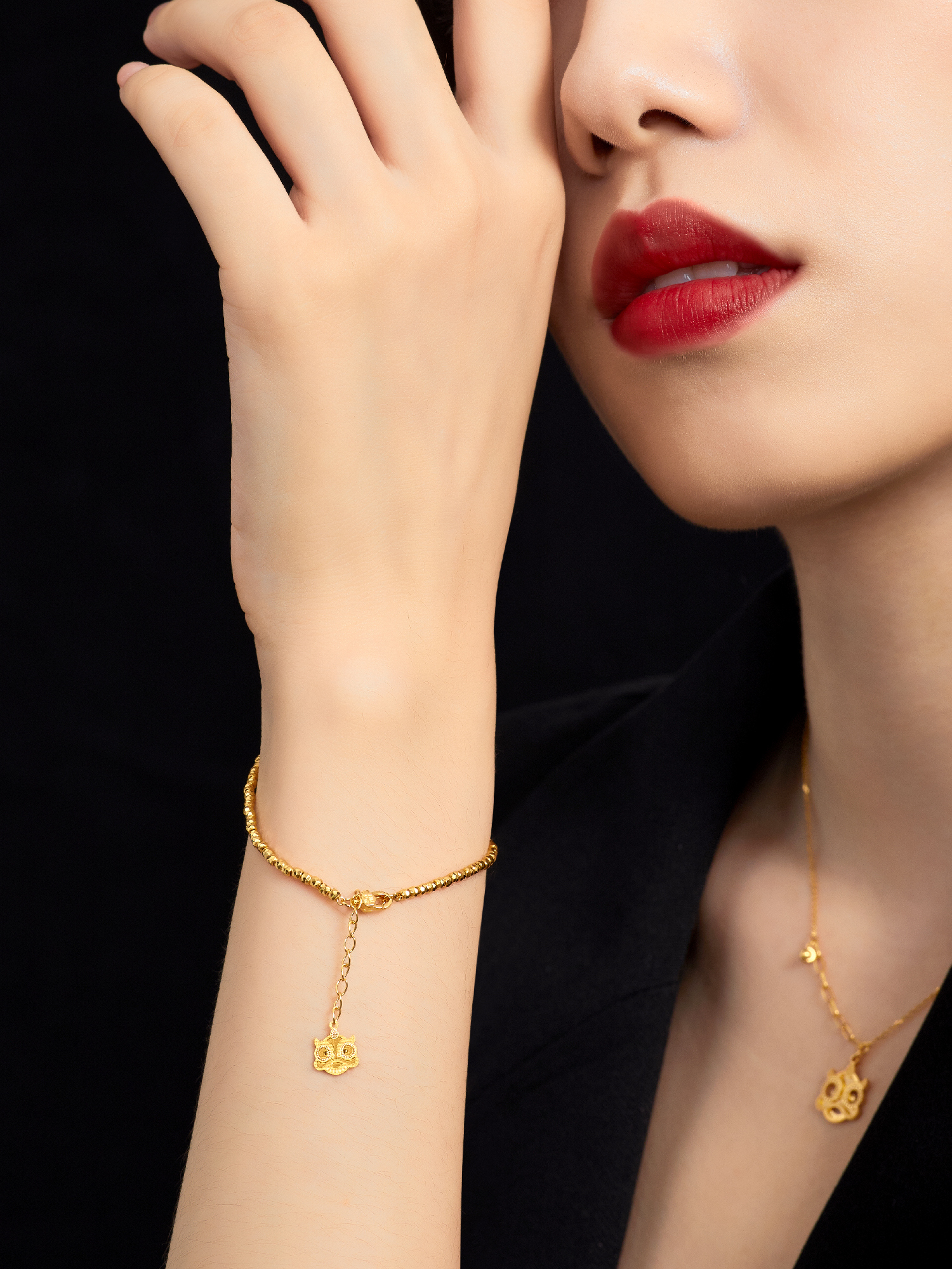 可爱的舞狮造型与绚丽黄金巧妙融合,配以不对称设计的项链,加上耳环和手链的套装,演绎别具一格的魅力。「舞狮」有「平安无事」之意,祈愿各位吉祥如意,平安好运时刻伴随。