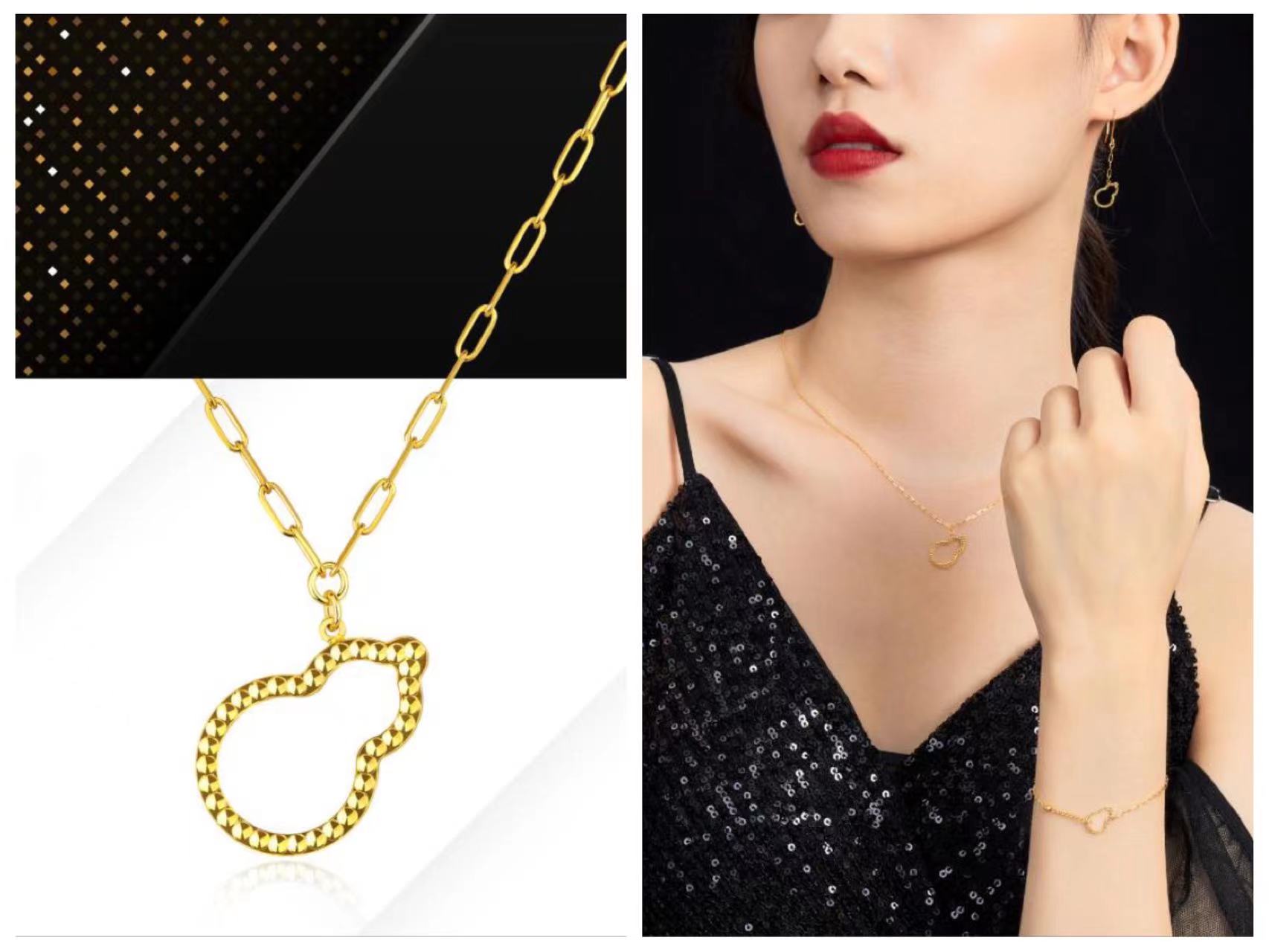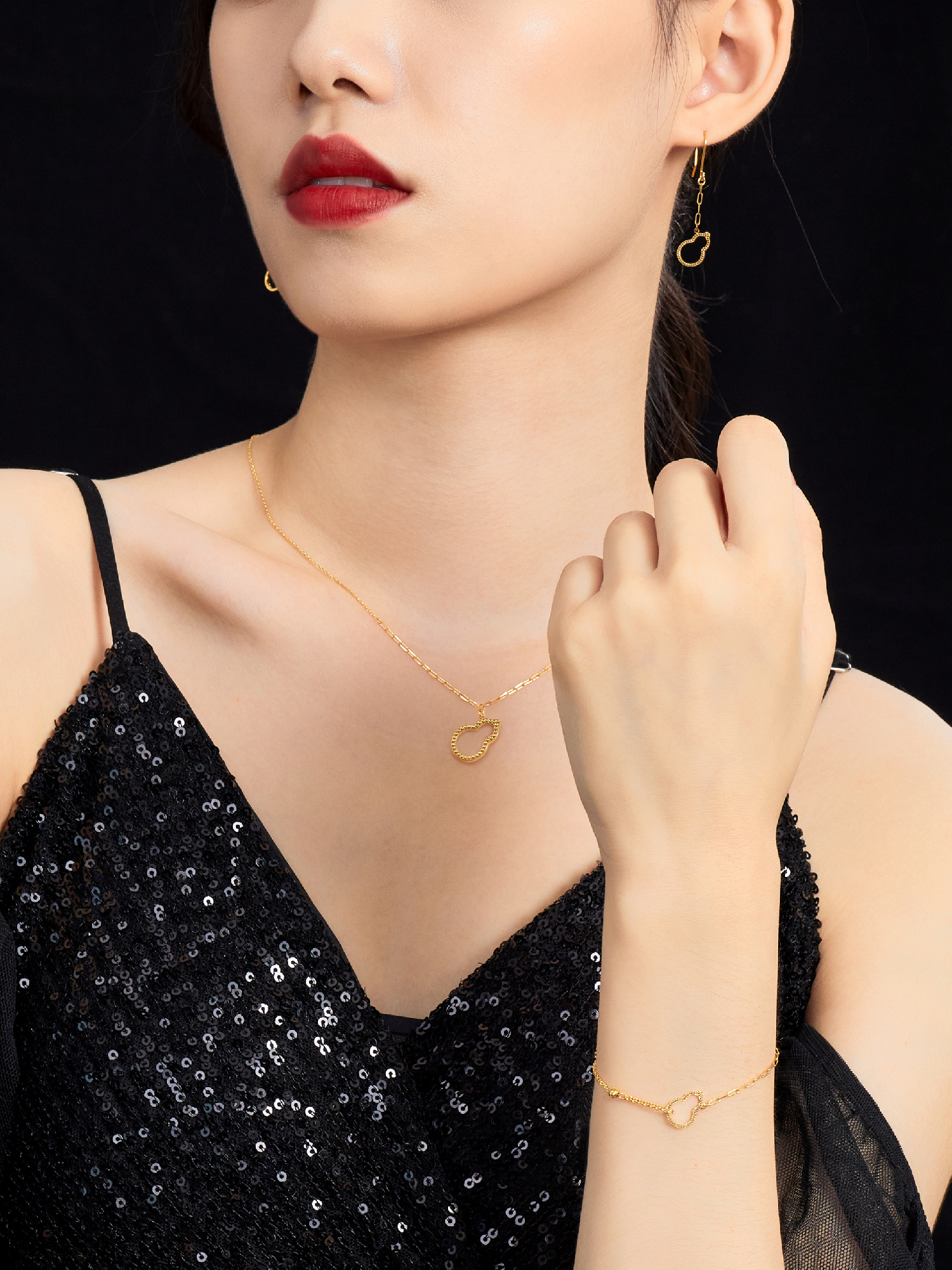 简洁利落的线条勾勒出葫芦轮廓,CNC车花工艺炫闪精致,不对称的手链链条设计尤显灵动,焕发闪耀迷人之美。整套精致百搭,满足不同场合的造型需求,点亮秋冬小幸运,祈愿福禄双全时刻围绕身畔。