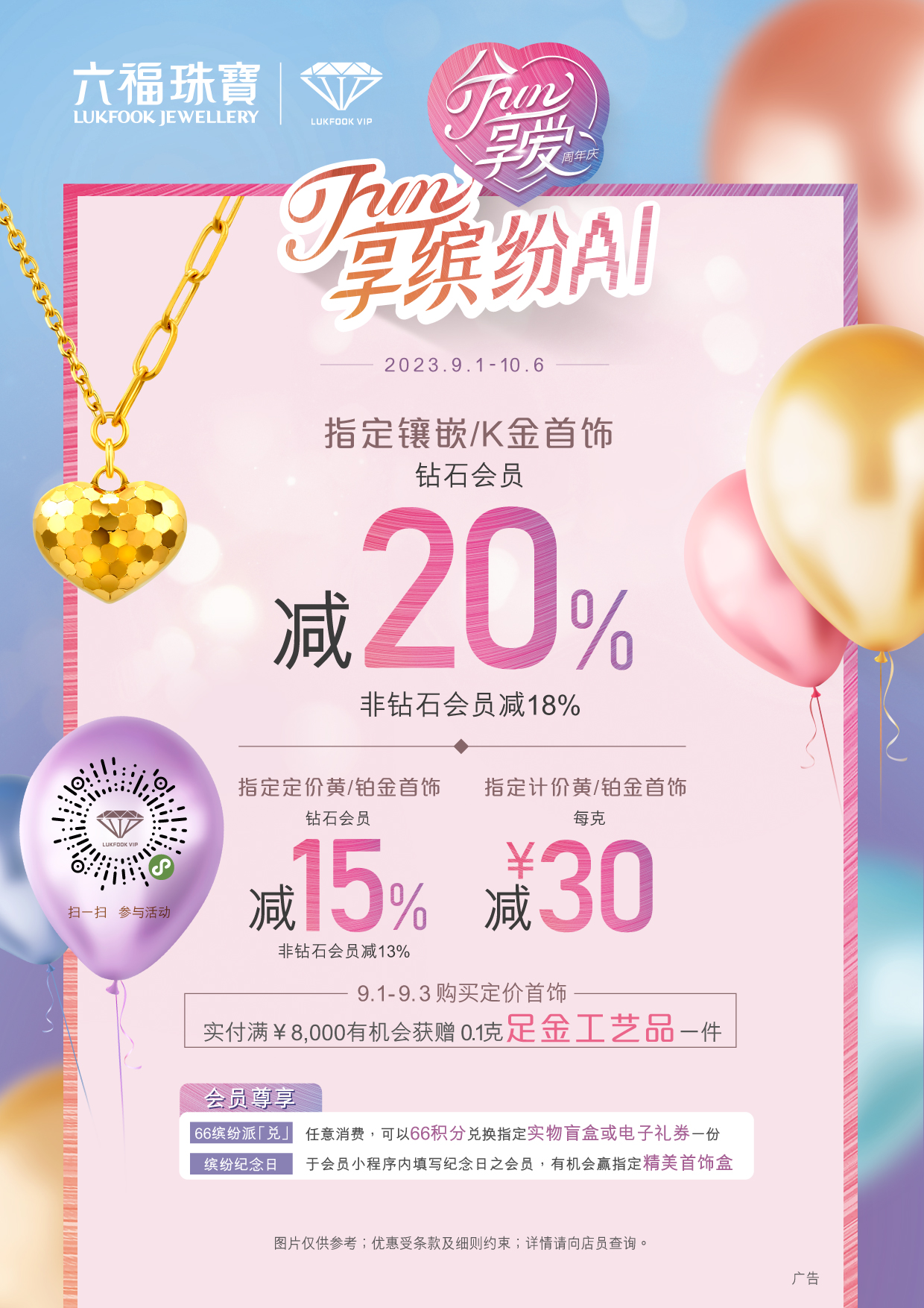 六福珠宝呈献【Fun享缤纷AI】惊喜购物优惠,即日起至10月6日,于中国内地指定分店可享:
