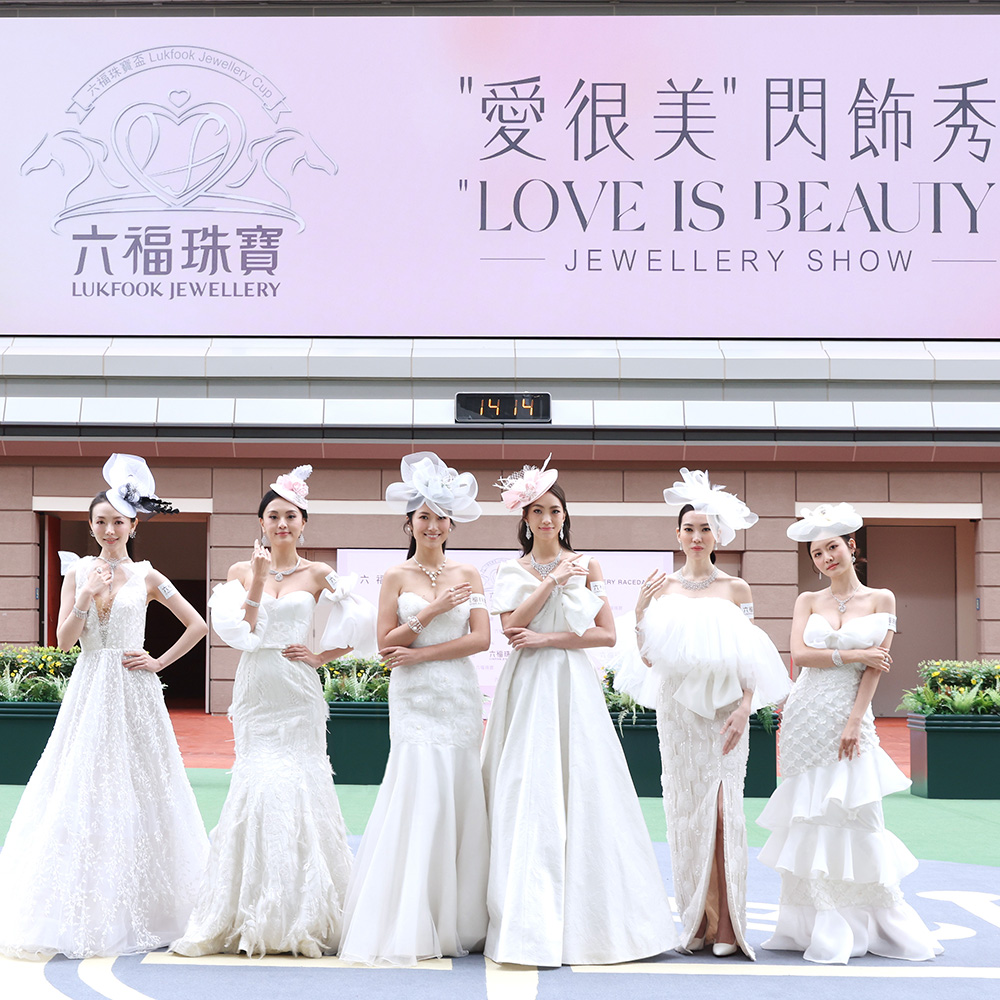 为配合当日的活动主题,大会特别设立皇冠试戴体验区,准备了多款造型优雅别致的头饰供女士们佩戴,尽显时尚美态。六位模特儿更分别于马匹亮相圈及马会厢房上演时尚闪饰秀,身穿由国际知名时装设计师何国钲先生(Dorian Ho)设计的全新2024年婚纱系列,展示多款总值港币数千万元的六福珠宝精选钻饰,夺目的造型与闪烁的钻饰互相辉映,叫人心动不已。