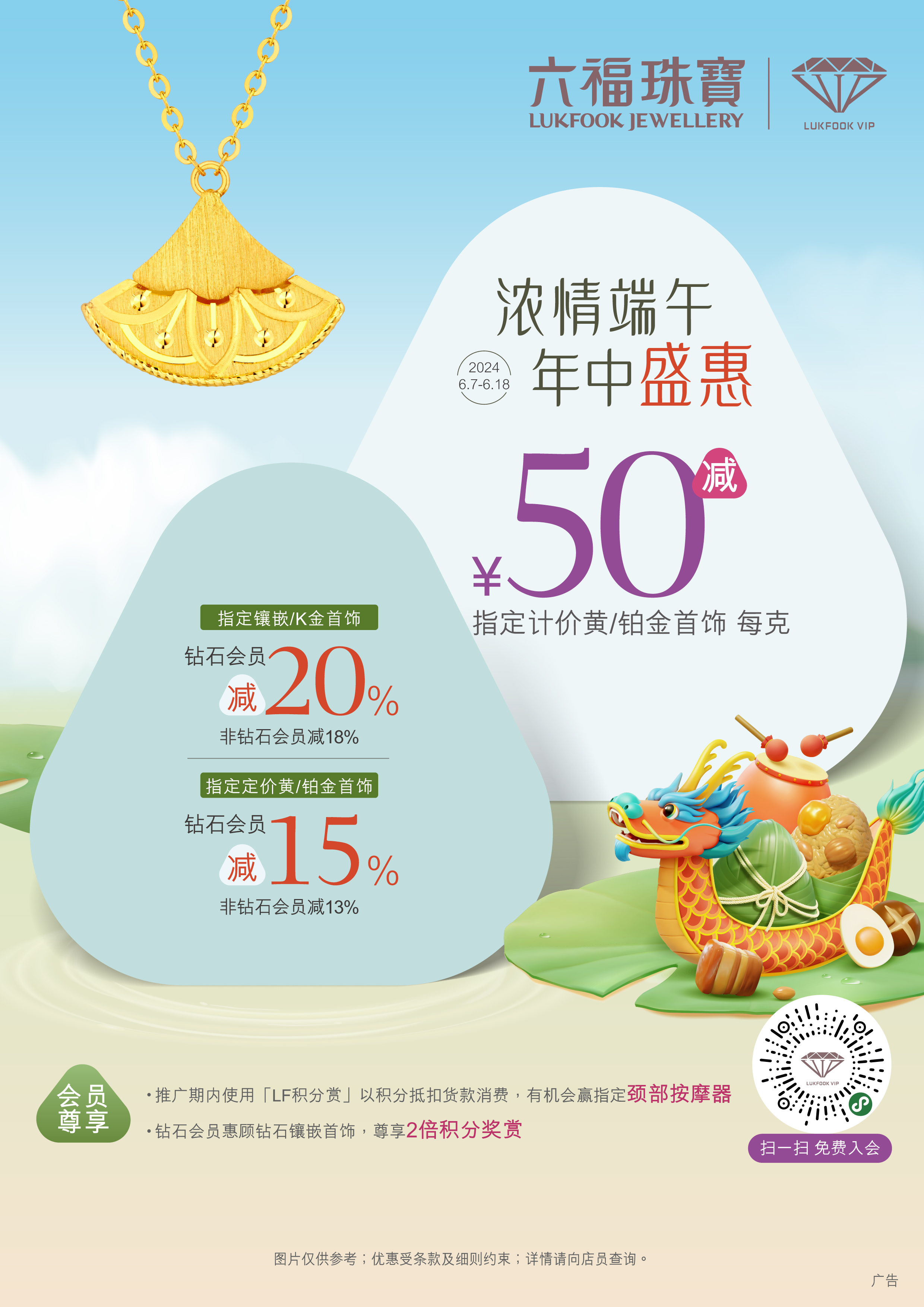 六福珠宝呈献「浓情端午 年中盛惠」购物优惠,即日起至6月18日,于中国内地指定分店可享: