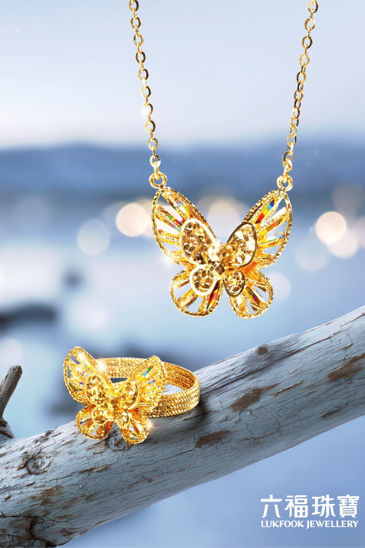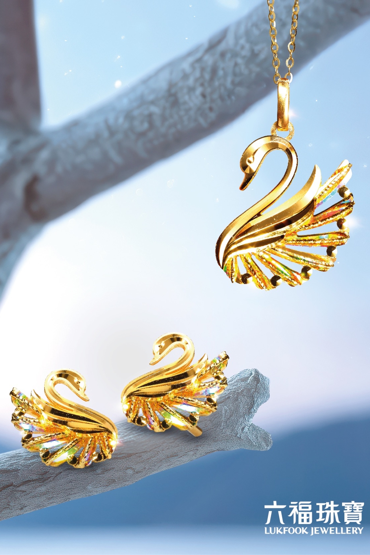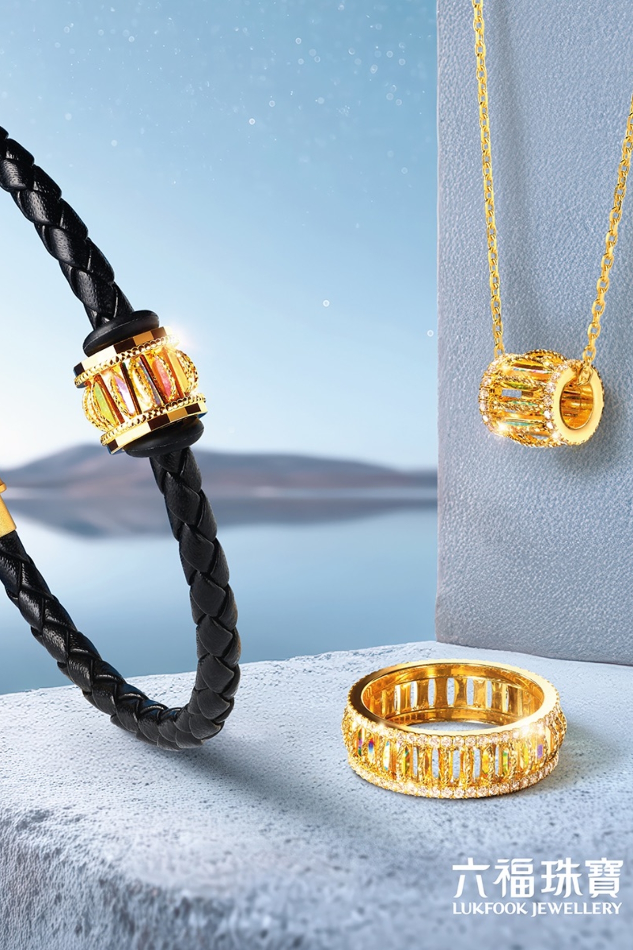 六福珠宝「冰 ‧ 钻光影金」在炫彩金片上复刻彷佛梯方钻石光彩,花丝勾勒外形轮廓,金丝刻面释放光芒,犹如黄钻般闪耀,焕发如自然界奇迹的丁达尔效应渐变光感。全新「冰 ‧ 钻光影金」首饰采撷光圈、天鹅、彩蝶等物象,带来一场绚烂夺目的光影盛宴,将爱的璀璨与誓言,铸成日夜相伴的永恒星辉。