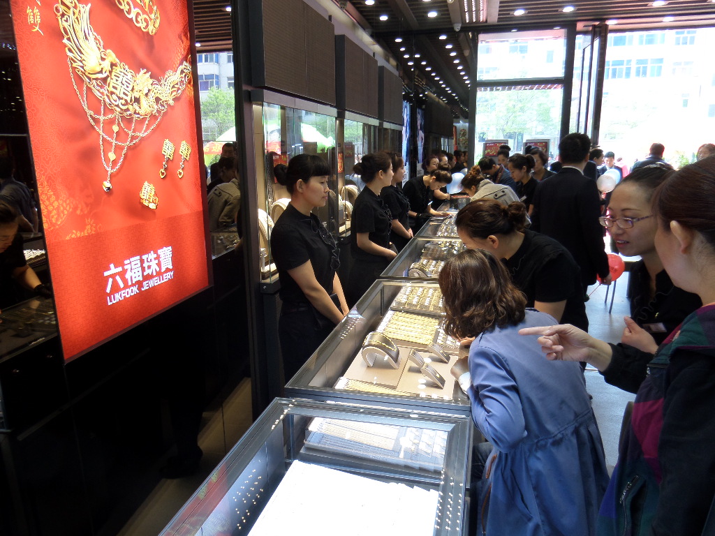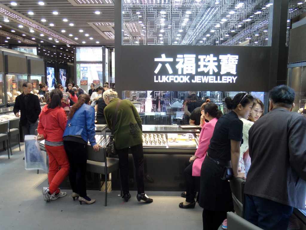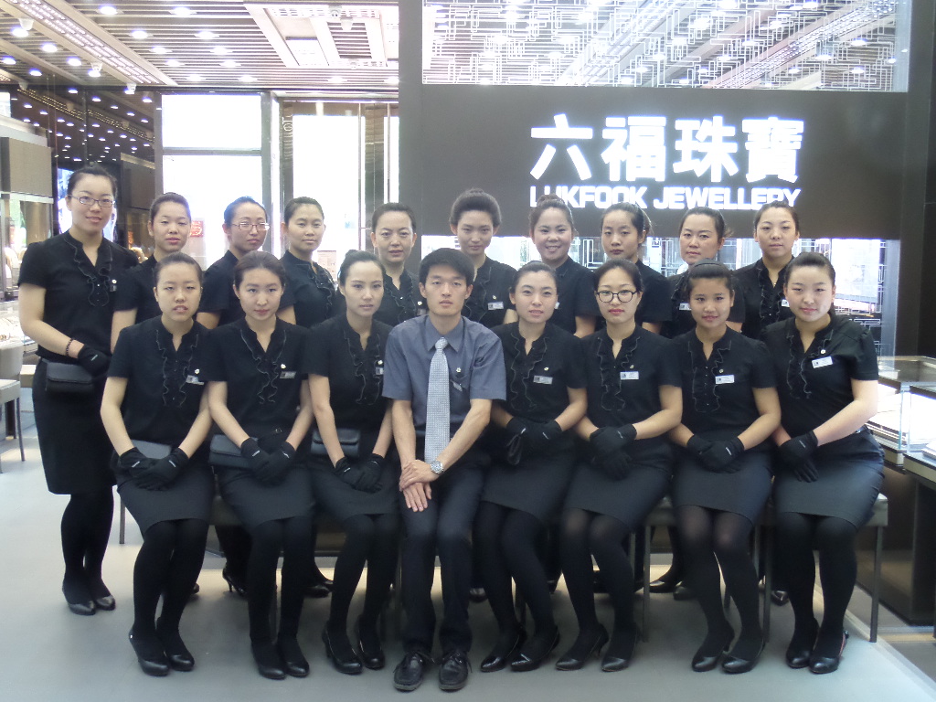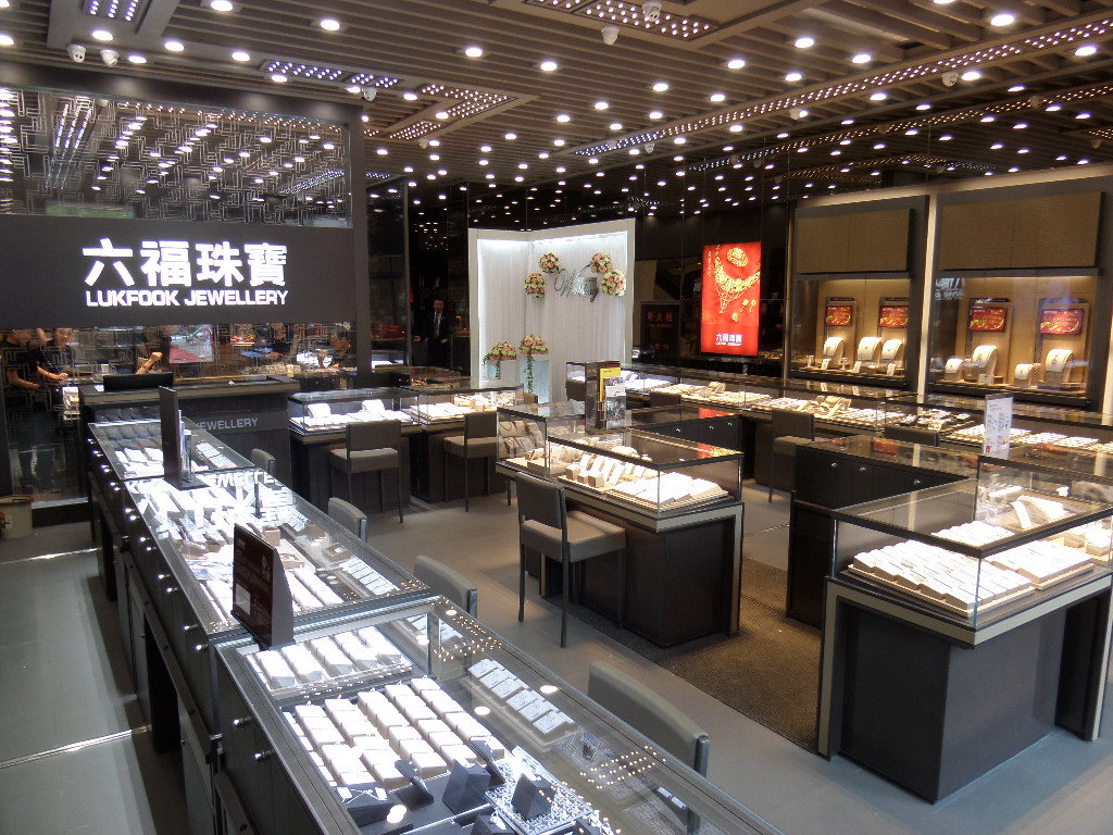 六福专柜位于商场一楼临街位置,占地120平方米,采用的最新一代装修风格及陈列道具,凸显出了店铺沉稳大气、时尚典雅的形象。专柜内货源充足,供广大消费者选购,不仅有美轮美奂的黄铂金、镶嵌货品以及多款六福独家产品,更为即将走入婚姻殿堂的新人特别设置了『西式婚嫁专区』,用于模拟婚嫁场景,同时配以主题音乐和专人摄影,营造出浪漫温馨之气氛,为顾客记录下美好的一刻,力求让顾客在挑选心仪饰品之同时亦能感受新颖优越之购物体验。
