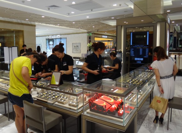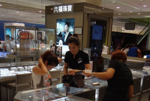 开业当天,虽烈日炎炎,却丝毫未能影响众多顾客前来领略香港品牌珠宝之风采。饰柜内琳琅满目之各款珠宝首饰,在灯光的映射下倍显华丽;其中,‘六福’全新推出之「囍爱」嫁囍金饰系列,将东方传统意蕴与时尚设计理念完美结合,造就精美绝伦之璀璨金饰,更是吸引了众多即将步入婚姻殿堂之爱侣们及其长辈之关注目光,用金饰传达长久情意,令此系列成为其结婚金饰之首选,但求共同见证一份坚定不移的金石良缘。