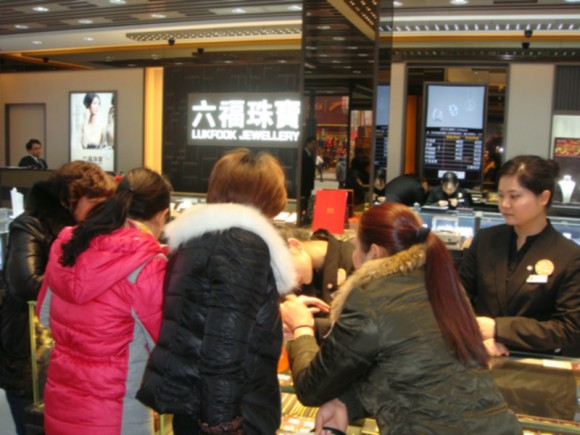 图片2:店铺内顾客人头攒动,纷纷试戴心仪珠宝