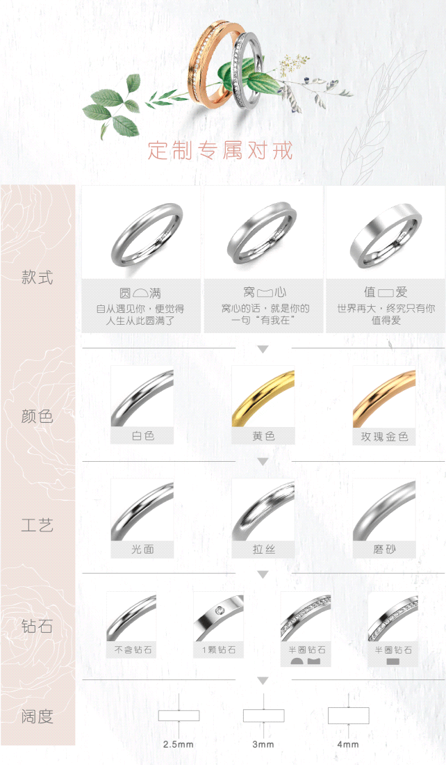 准新人必读!教你5个定制婚戒步骤结婚是人生大事,揭开人生新的一页,因此准备婚戒更是意义重大。婚戒象征着承诺,承载着你俩独一无二的爱情,把这份如斯神圣的爱情牢牢套在无名指上,是一生只爱一人的信仰。婚姻既是神圣的信仰,一生一次,因此挑选结婚戒指绝不能马虎。可是,并不是每对新人都懂得挑选婚戒,因此各位新人如何挑选或定制别具意义的婚戒也是一门重要的学问。 |