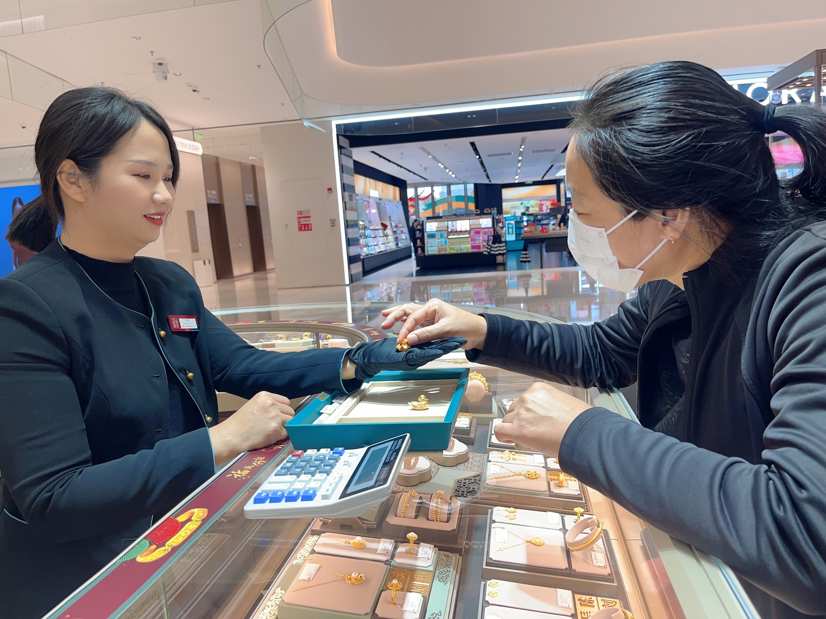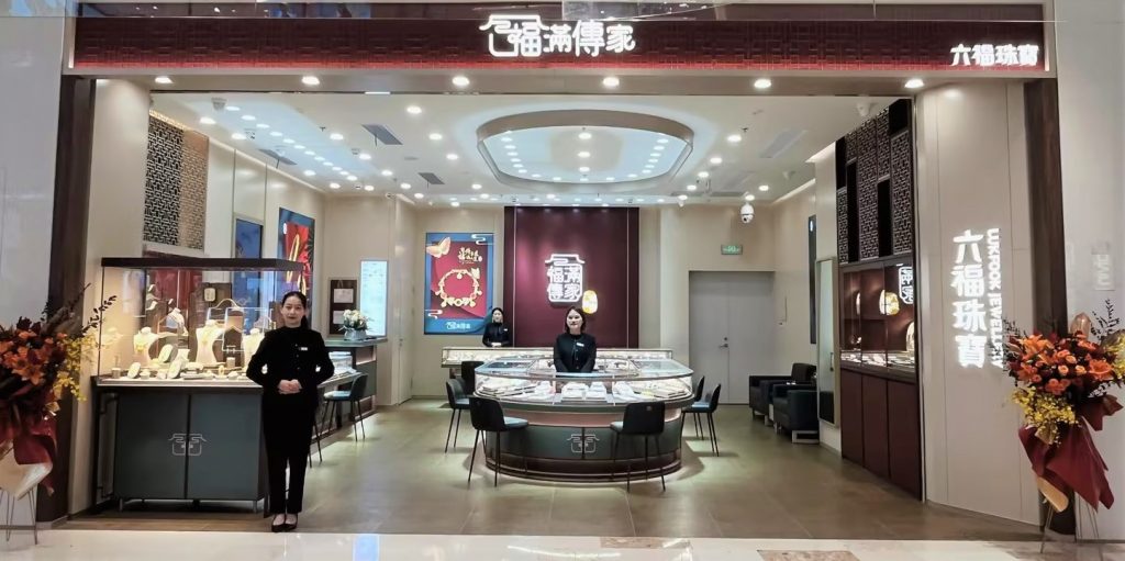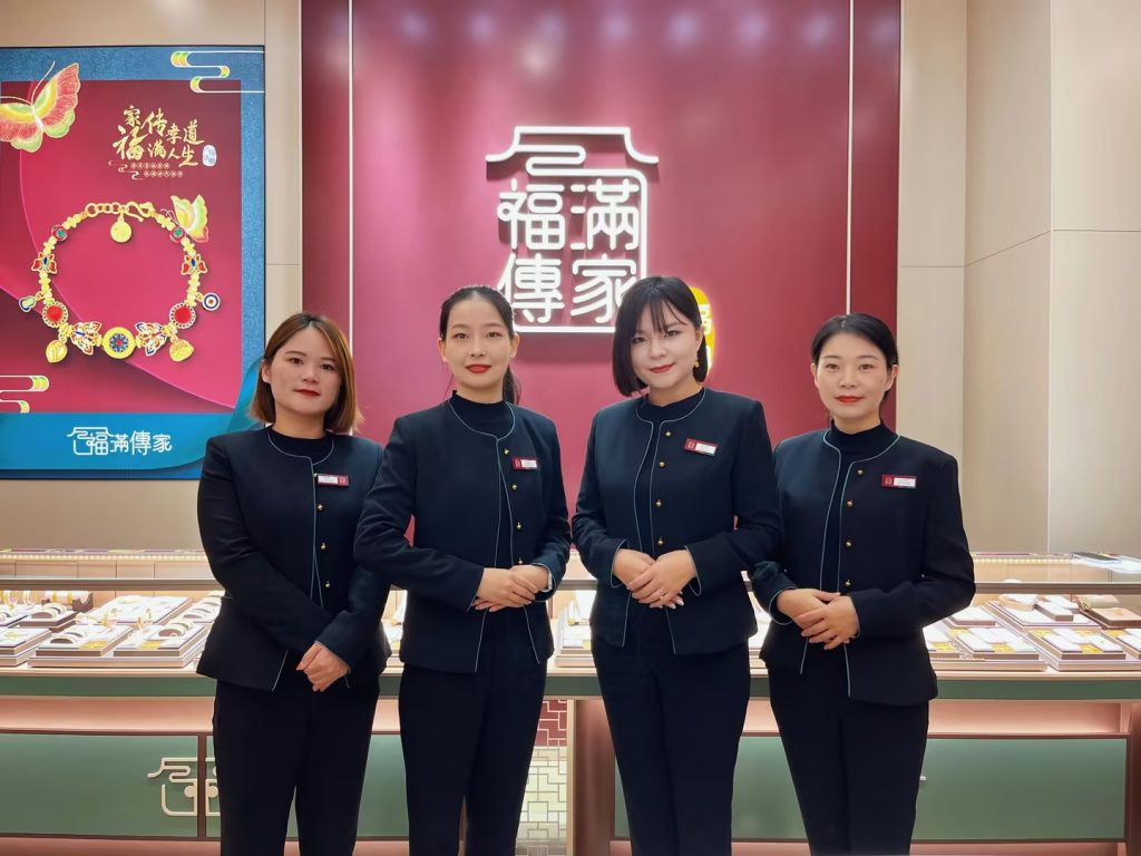 「松山湖万象汇福满传家专卖店」位于商场一楼,其装潢形象撷取极具东方美学的建筑元素及主色调,营造出浓浓国风古韵及现代时尚相结合的购物空间,尽显现代中式美学的神髓。店内专属道具台上陈列的各式珠宝首饰,精刻雕琢、古意盎然,古法技艺与传统文化互相融合,打造出极具文化传承及收藏价值于一体的黄金饰品,方寸之间,成为家族精神延续的传世瑰宝。开业当天,现场销售人员穿着时尚与古典元素结合的制服,尽显端庄大方,加之热情悉心的专业接待,让纷至沓来的顾客如沐春风、倍感尊贵。