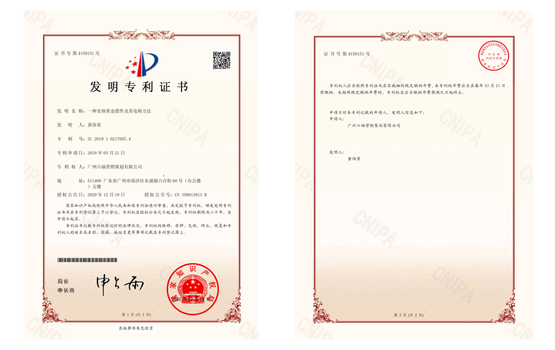 六福集团自主研发的「一种实体黄金摆件及其电铸方法」获得国家知识产权局授权「发明专利」(专利号:201910217097.4),肯定了集团的创新技术发展及提升核心竞争力,进一步巩固在业界的领先地位。