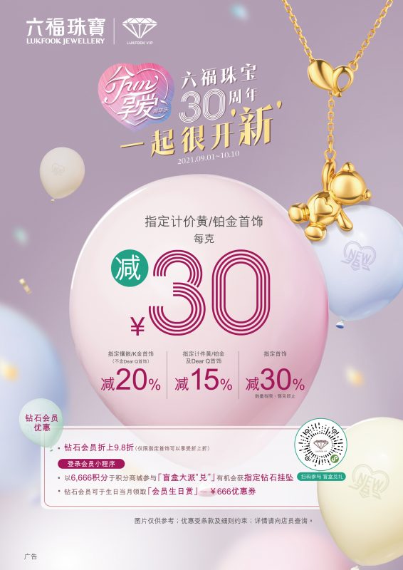 六福珠宝呈献「六福珠宝30周年 一起很开『新』」精彩购物优惠,与大家欢乐同贺周年庆。即日起至2021年10月10日,于中国内地指定店铺可享: