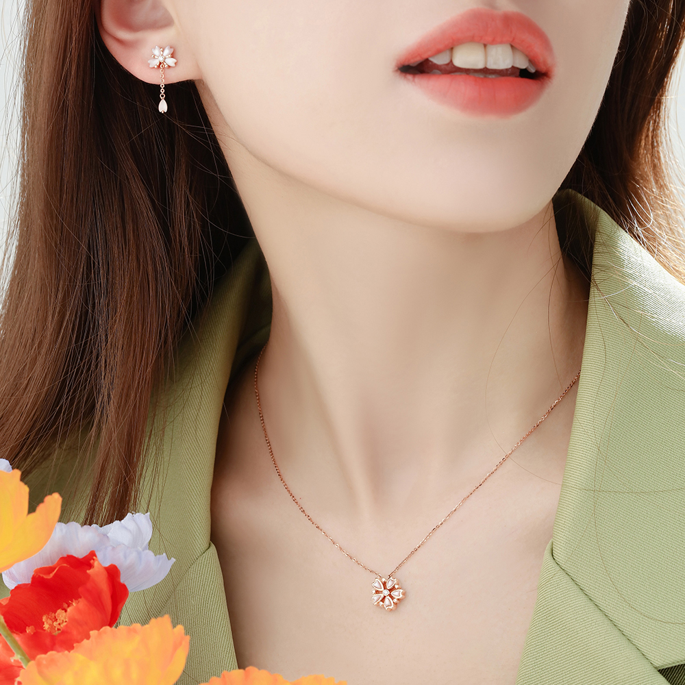 以18K金搭配粉嫩贝母,打造出多款栩栩如生的樱花造型项链及耳环,在闪耀钻石的点缀下,尤显灵动纯粹,焕发青春气息。不得不提可开合的项链,一款两戴,既可拼合樱花造型,亦可展开如微笑模样的造型,随心切换,满足不同场合的搭配需求。