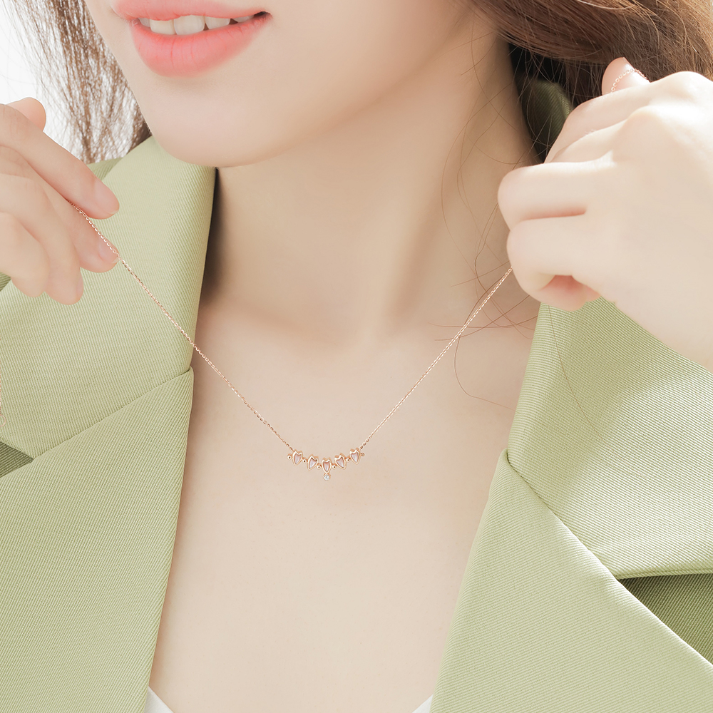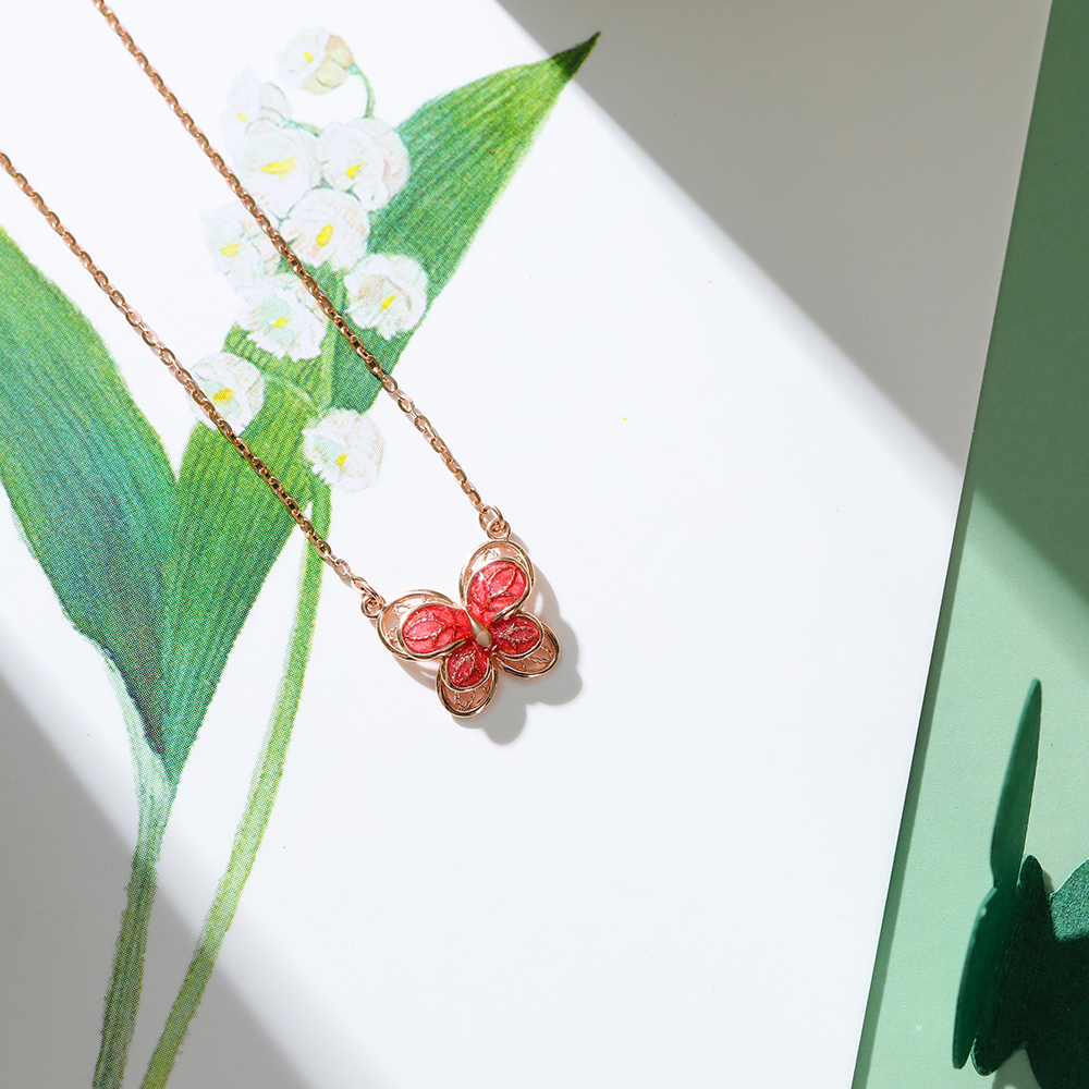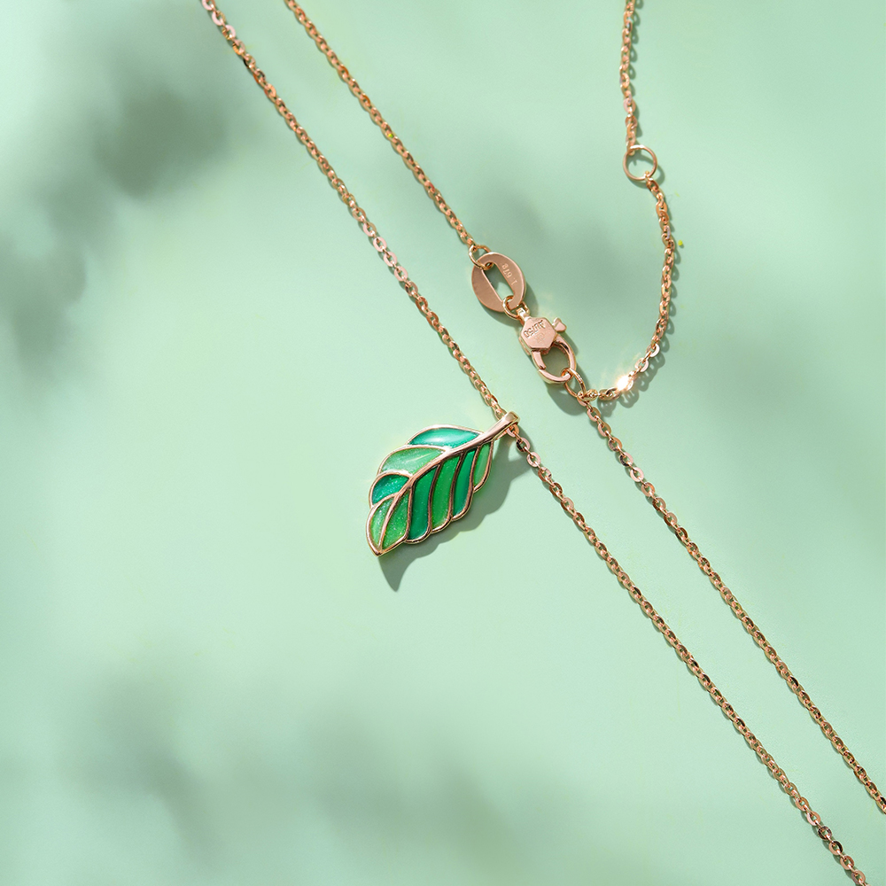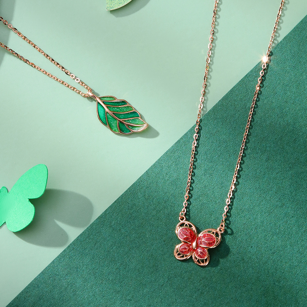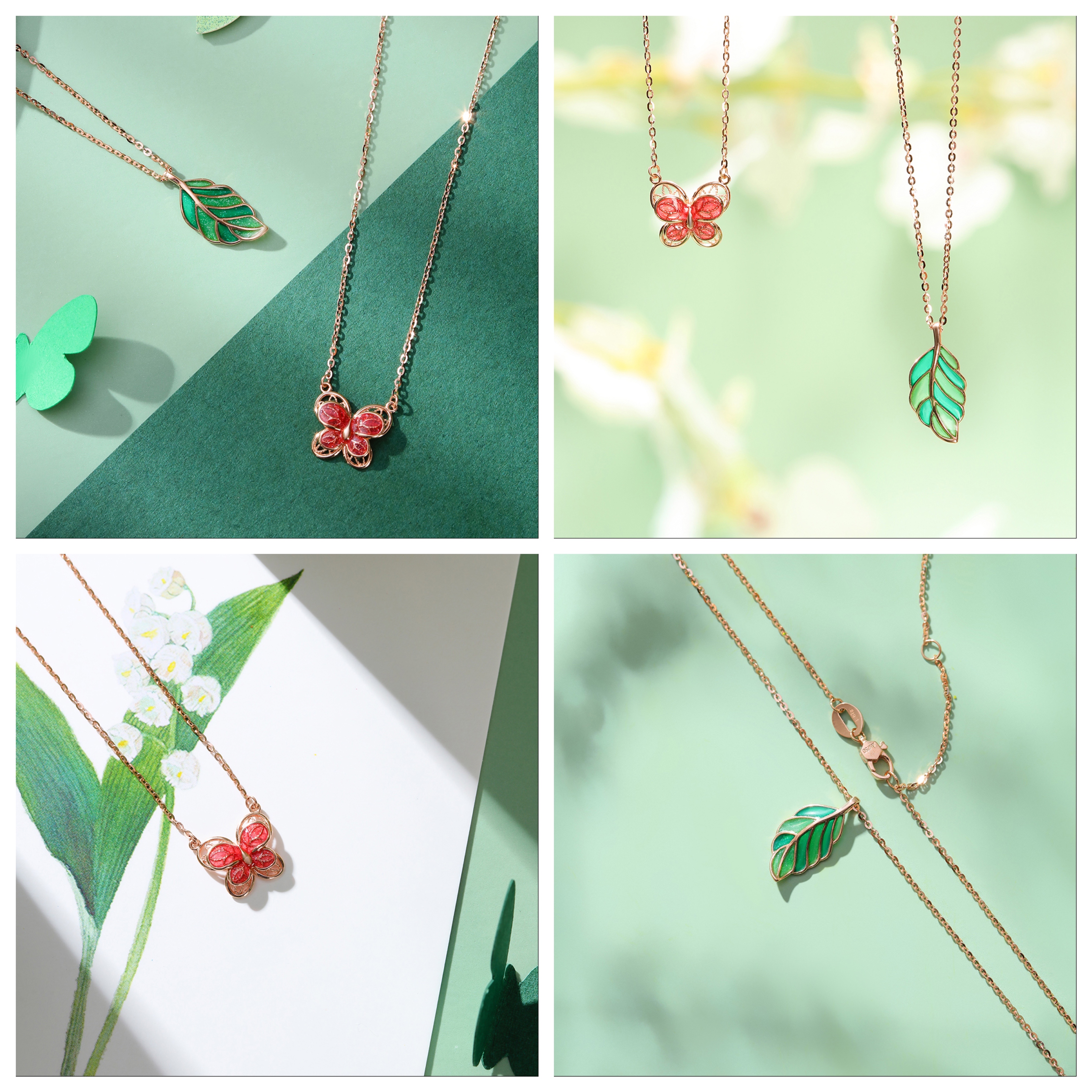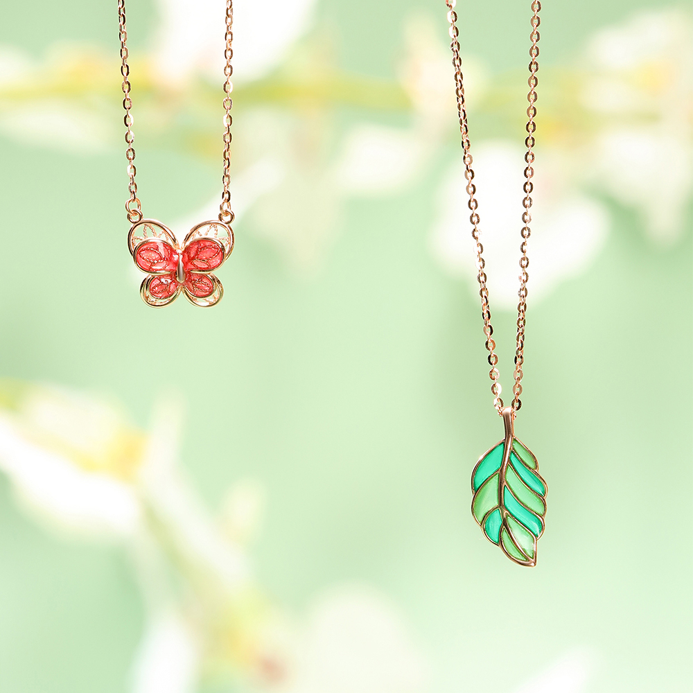 以满载大自然气息的蝴蝶、绿叶幻化出两款灵动可人的18K金项链,精致的造型融合艳丽珐琅,生动立体,清新亮丽,仿如在述说着爱情的浪漫与幸福,佩戴于颈间尽显自然之美,焕发满满的朝气和活力。