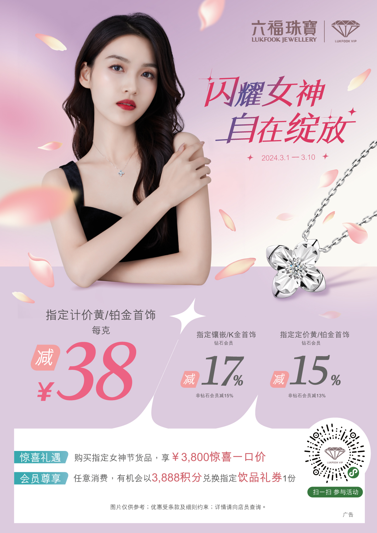 六福珠宝呈献「闪耀女神 自在绽放」购物优惠,即日起至3月10日,于中国内地指定分店可享: