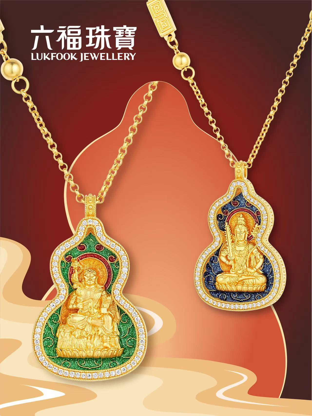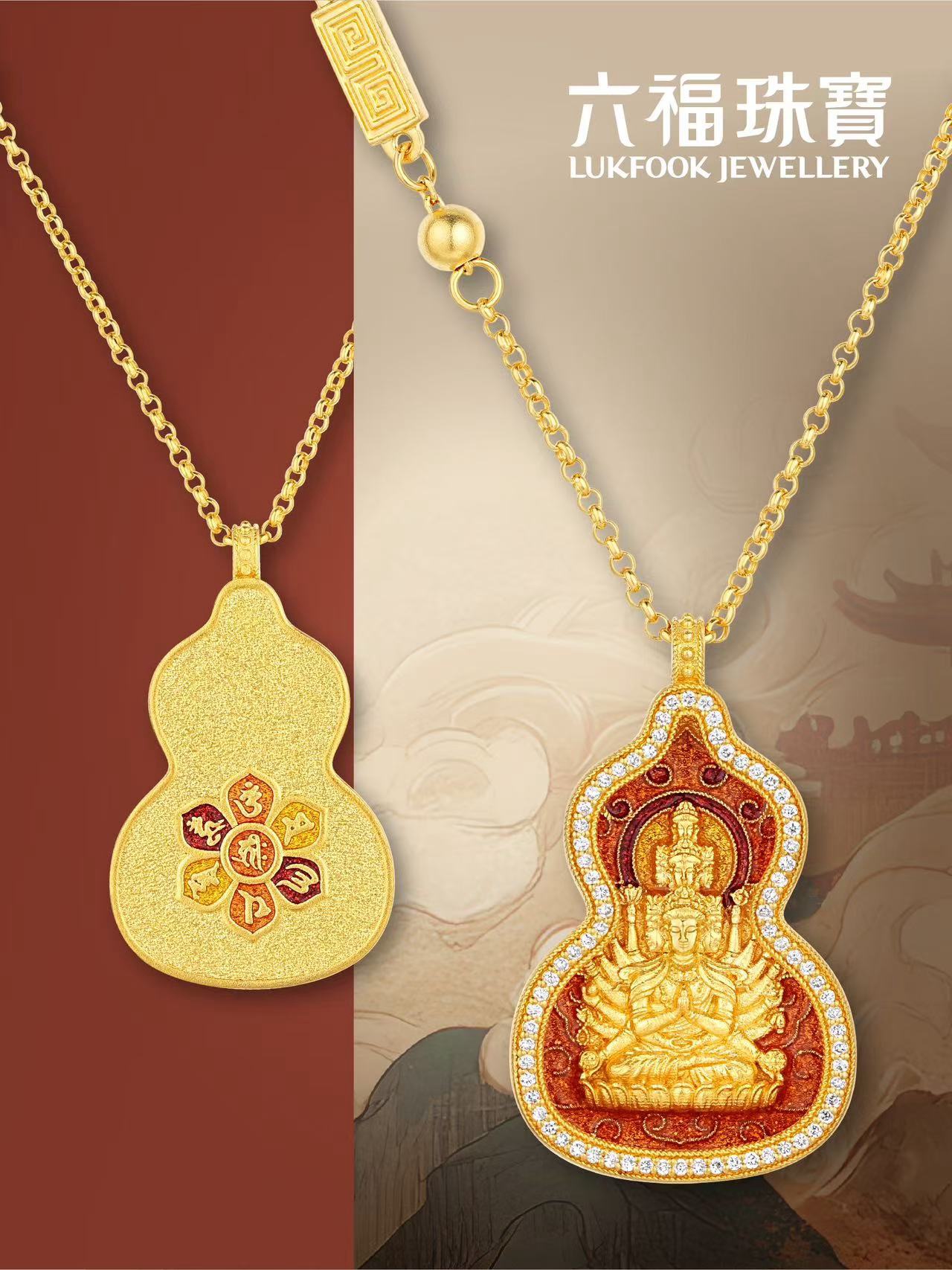 金韵呈祥,多款「福禄守护佛」足金吊坠及项链,以葫芦造型为佛龛,背面点缀「六字箴言」梵文佛号,同时备有足金镶钻及素金款可选择,满足不同佩戴需要。而立体精致的「守护佛」足金串饰更是栩栩如生,戴上它,祝福常伴左右!此外,多款神态祥和自如的佛像吊坠及佛珠手链,福光熠熠生辉,无论是自用还是送礼,都能彰显心意与祝福。