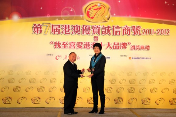 广州日报社副总编辑黄卓坚女士颁发「港澳优质诚信商号(2011-2012)香港区」奖项予六福集团总经理区国球先生。