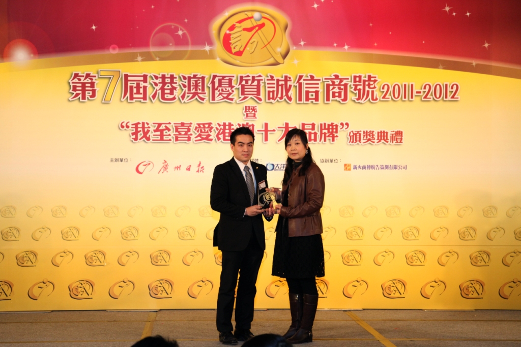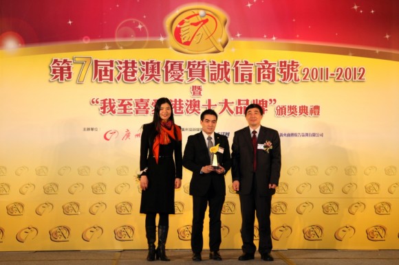 六福集团执行董事黄浩龙先生从广州日报社专版新闻中心副主任黄晓蕴女士手中领取「港澳优质诚信商号(2011-2012)澳门区」之奖项。