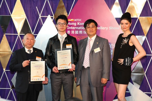 香港珠宝制造业厂商会主席及香港贸易发展局香港国际珠宝展筹备委员会2012会员林志强先生(左三)颁发奖项予六福集团总经理区国球先生(左一)及珠宝设计师谢嘉荣先生(左二)