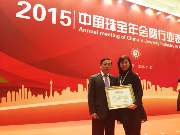 中国珠宝玉石首饰行业协会副秘书长杨似三先生颁发奖状予六福集团中国业务副总监(华北区) 周嘉小姐