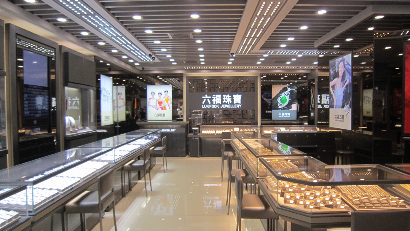 该六福珠宝专柜从外观形象上,就令人眼前一亮,于众多珠宝品牌中脱颖而出。137平方米宽敞的店铺面积,给予顾客舒适、畅快的购物体验;位于正门入口处的大型展示橱窗,宛如电影海报般,展示店内将深藏各式璀璨瑰宝。整个专柜以“六福”英文名字之首个字母“L和F”组成的图形贯穿始终,如LF图案玻璃装饰的招牌墙,不仅特显店铺主题,更营造出时尚华丽的效果;立体双层玻璃灯箱,以互相重迭的线条转化成LF图案,形成走马灯的效果,既抢眼夺目又富有时尚感。