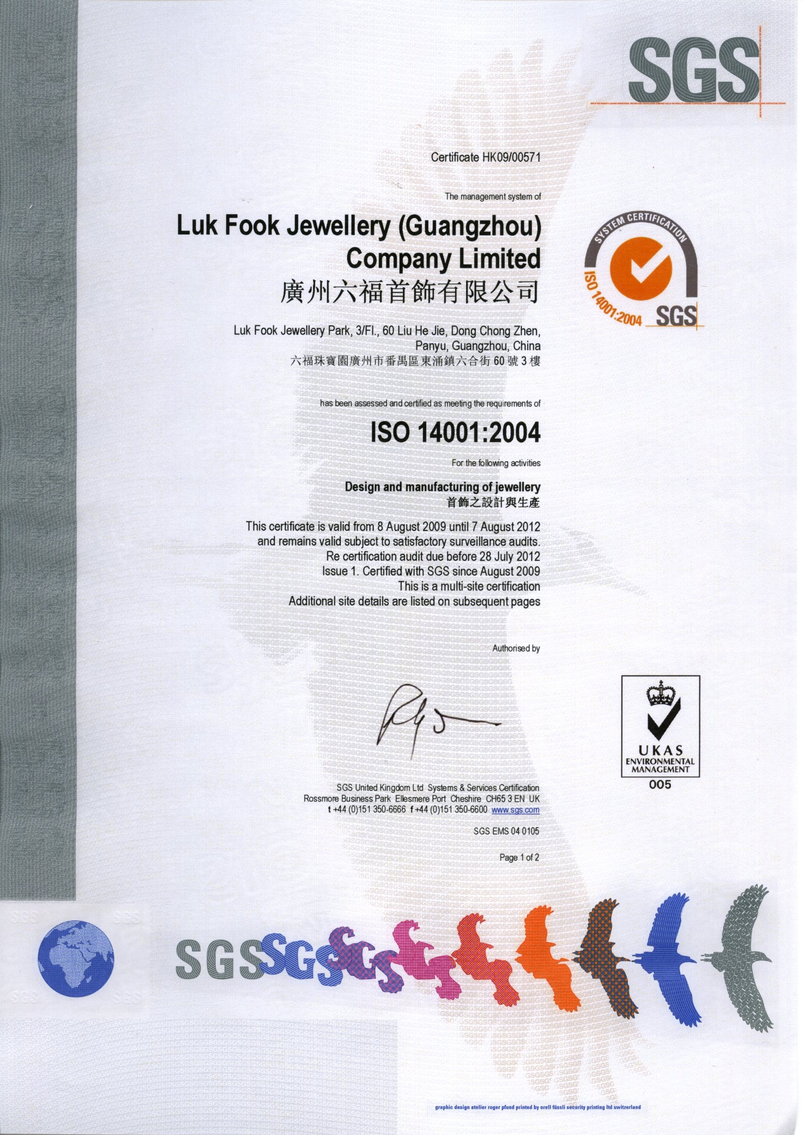 六福集团位於广州市番禺区的珠宝加工厂获颁发ISO 14001: 2004环境管理系统认证