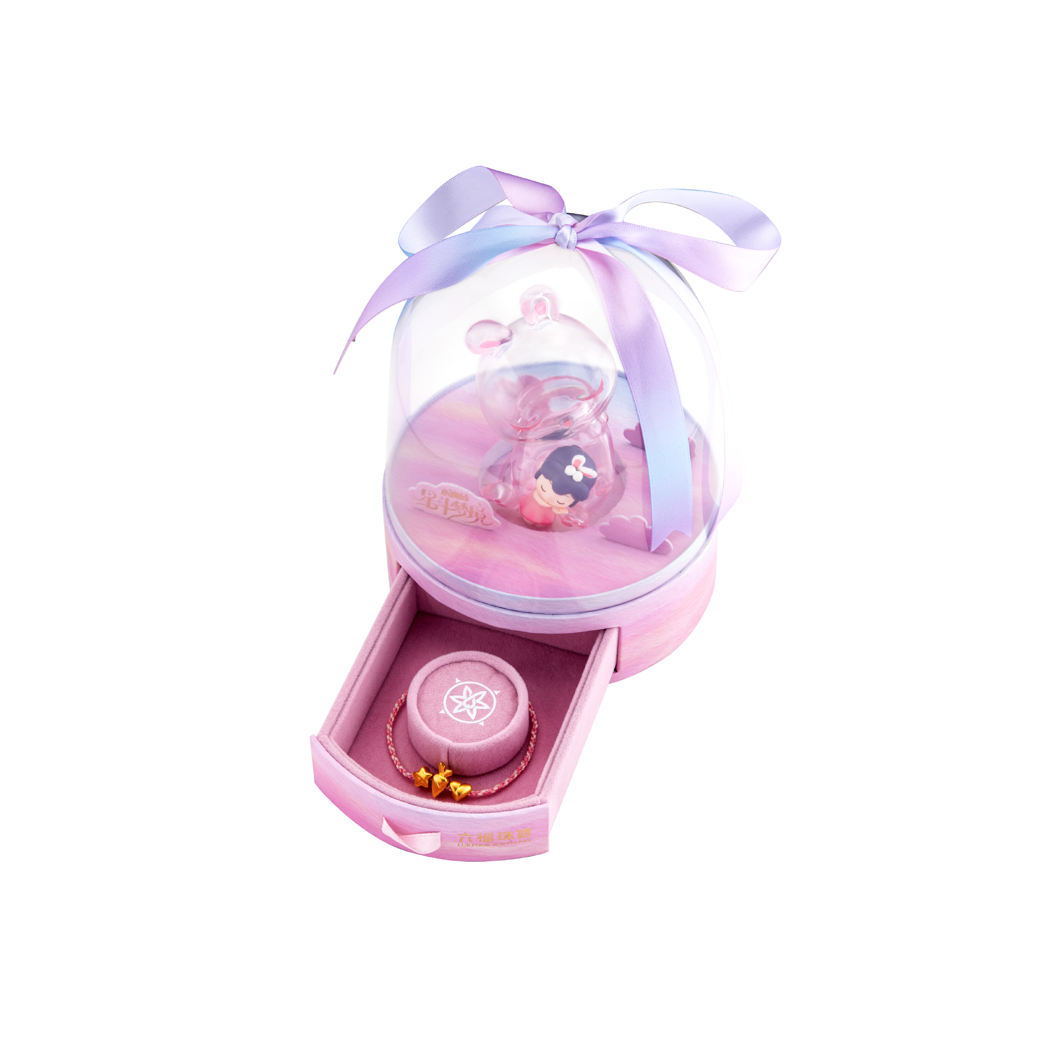 以穿越玄幻小说《斗罗大陆》中的“小舞兔”形象为设计,打造环抱小舞的透明集金罐与足金胡萝卜串饰套装,套装配备专属手绳及包装盒,萌趣可爱,实用与装饰兼备。