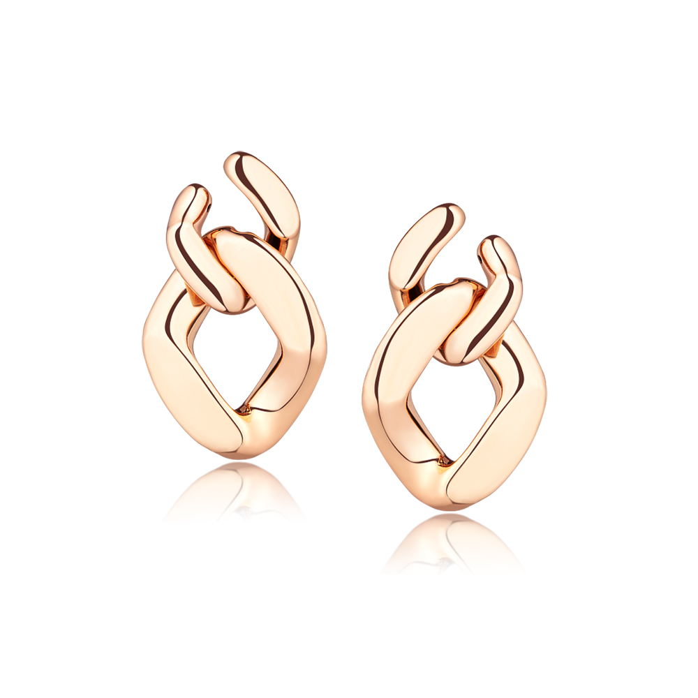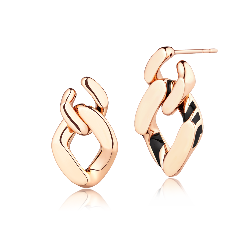 简约的两环相扣小方扣造型,双面设计,一面融入黑色珐琅点缀成豹纹元素,时尚且百搭多变。耳钉以分拆式及正反两面的独特设计,可拆开变成耳钉单戴、配K金链变成项链或配手绳作腕饰,轻松实现一款八戴。