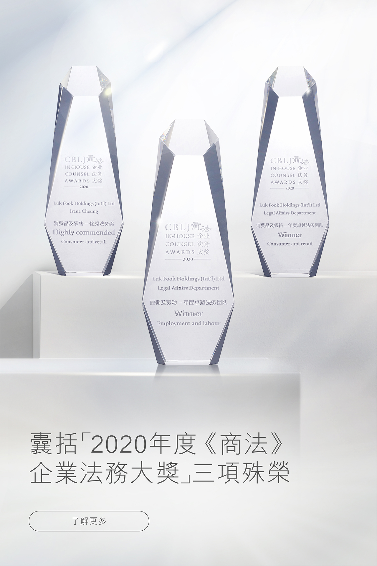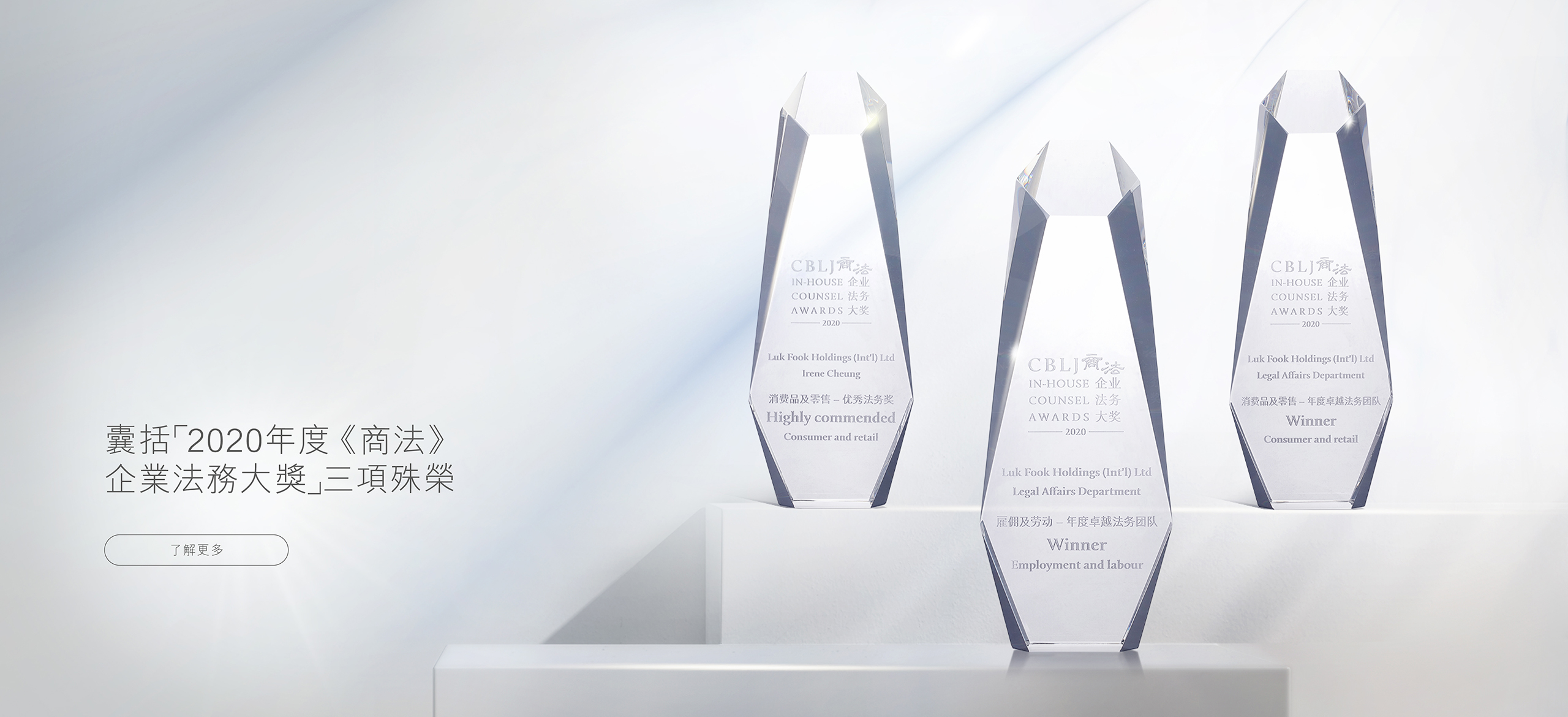 (2021年6月18日) ── 六福集團(國際)有限公司(「六福」/「集團」)(股份代號: 00590)欣然宣布集團獲得亞洲知名法律期刊《商法》(China Business Law Journal)頒發「2020年度《商法》企業法務大獎」三項殊榮,包括「消費品及零售—年度卓越法務團隊」和「僱傭及勞動—年度卓越法務團隊」兩項團體獎的冠軍,及集團高級法務顧問張雅玲小姐榮獲之「消費品及零售—優秀法務獎」個人獎,以表彰集團在法律專業上的卓越表現。 六福集團主席兼行政總裁黃偉常先生表示:「我們感到非常榮幸集團法務部團隊獲得三項嘉許,及其法律知識和專業性獲得業界高度評價和廣泛認同。是次獲獎肯定了集團在風險控制、合規管理、打擊侵權等方面的法律專業水平。集團法務部團隊資歷豐富、實力雄厚,而且時刻具備維權觸覺,今後將繼續運用專業的法律知識和發揮團隊效益,進一步提升企業法務工作效率,以維護集團於全球業務的合法權益。」 集團格外重視商標及品牌保護,法務部在集團業務團隊的積極配合下,至今於中國內地及其他地區已成功異議及打擊超過800個近似侵權商標及接近1,000間的侵權珠寶店舖,以維護集團品牌形象。另外,法務部更積極解決有關勞動的潛在爭議,就不同個案提供法律意見,降低了企業勞工僱用的風險。 《商法》是亞洲知名的商業法律資訊媒體,其企業法務大獎透過徵集各行業高管、法律專家和法務同行的提名推薦,經評選後向各法律領域中有卓越成就的企業法務人士及團隊授予獎項,以表彰企業法務作出的貢獻。 六福集團高級法務顧問張雅玲小姐榮獲「消費品及零售—優秀法務獎」個人獎 「2020年度《商法》企業法務大獎」三項殊榮獎座 集團傑出法務團隊榮獲兩項團體獎 ~完~