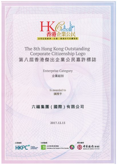 (2018年1月15日)── 六福集團(國際)有限公司(「六福」/「集團」)(股份代號:00590)欣然宣布集團於「第八屆香港企業公民嘉許計劃」中榮獲香港生產力促進局頒發「企業組別」嘉許,肯定集團為履行及推廣企業社會責任所作出的努力。